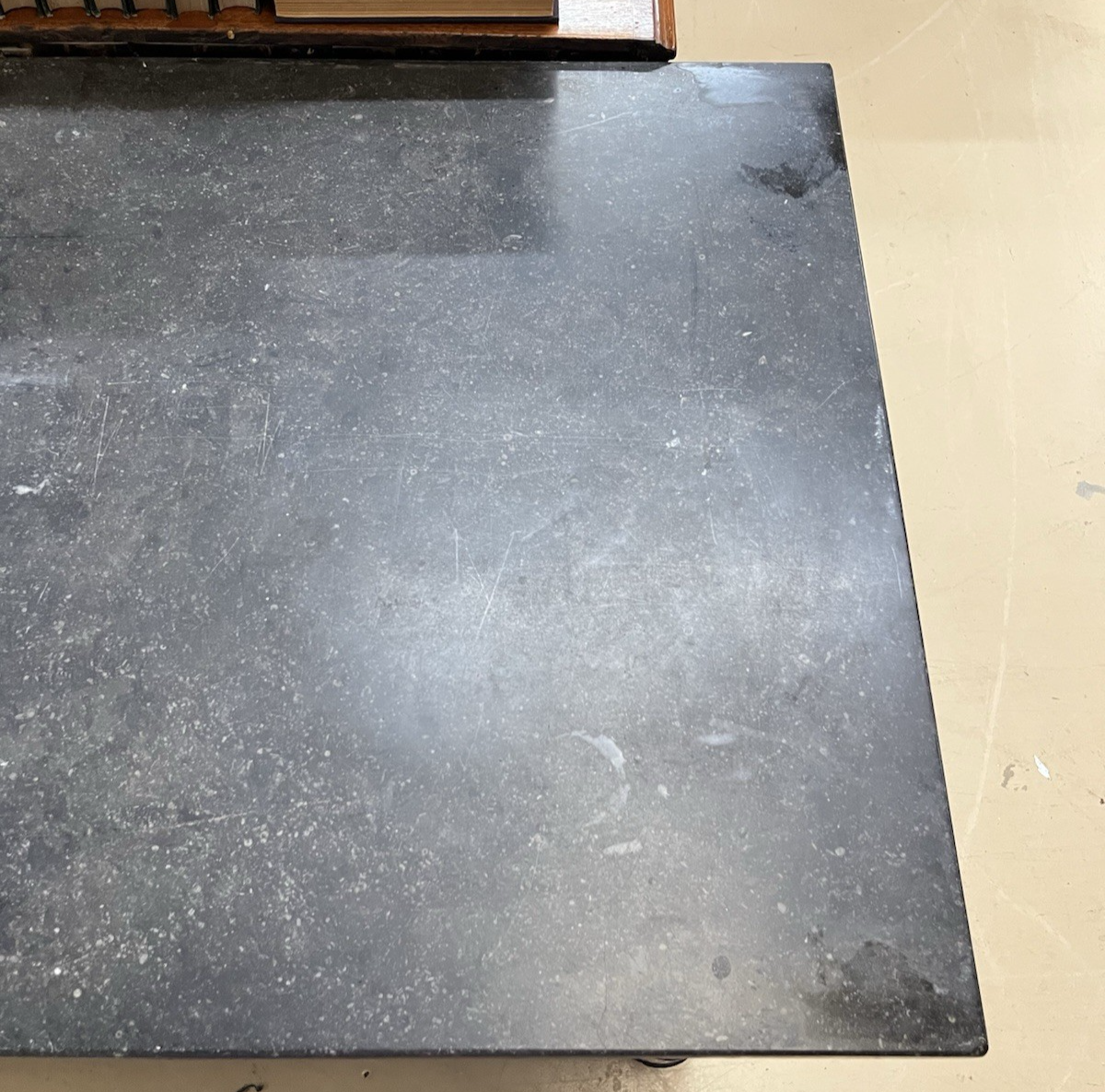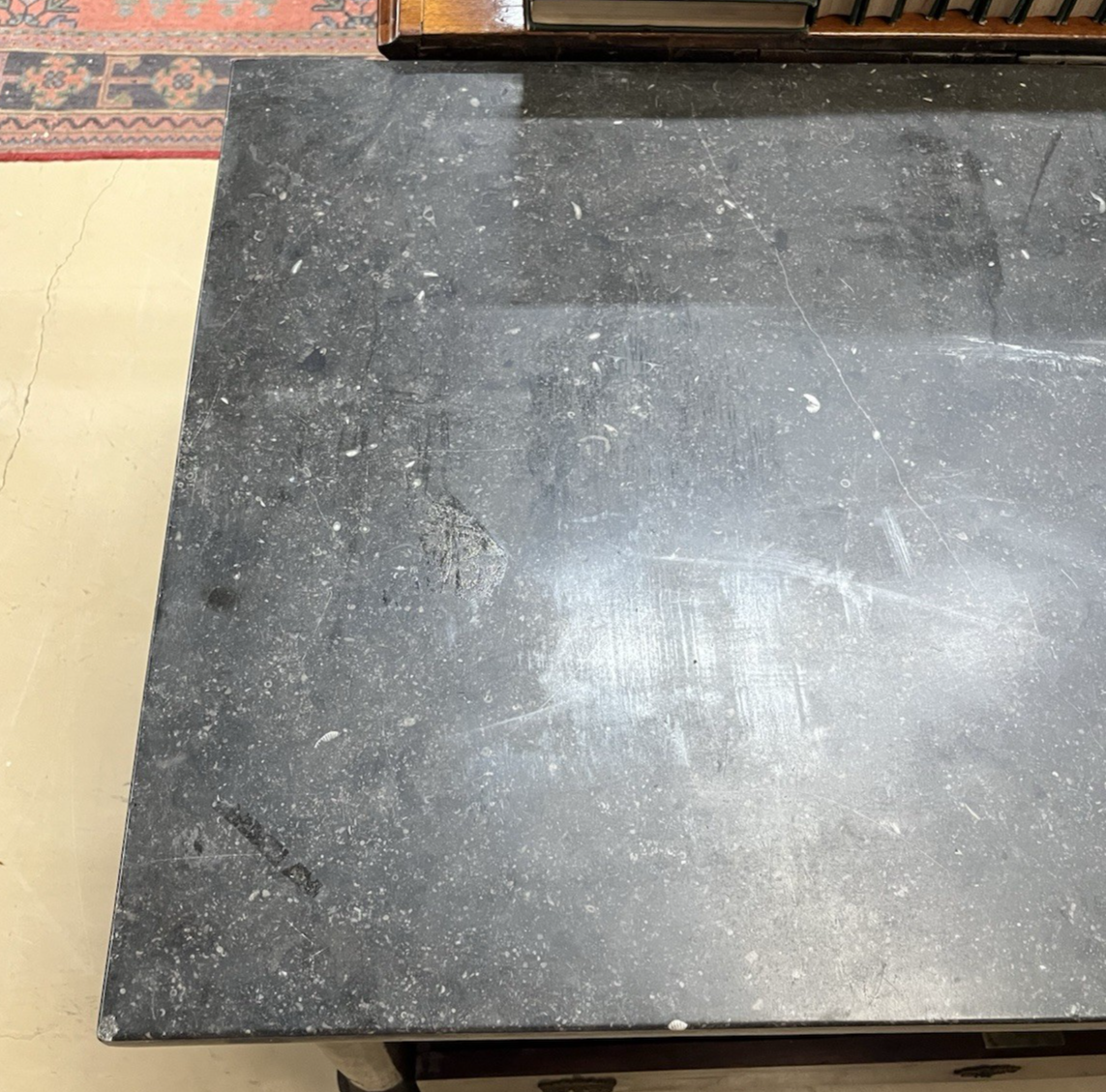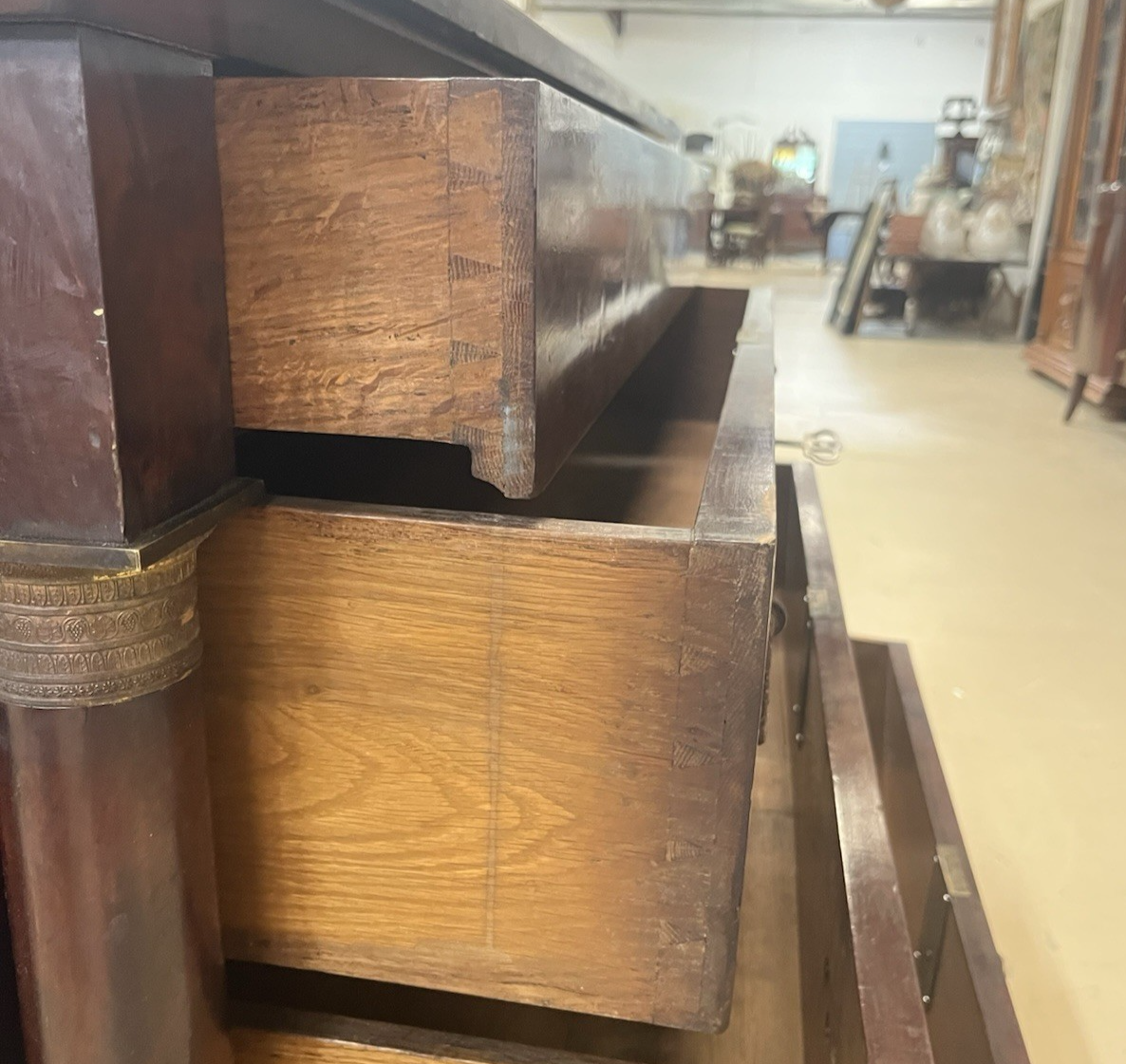 French Empire marble-top flame mahogany commode, signed P. Pister, dated 1819, having marble top, over projecting frieze drawer, above three additional drawers, flanked by turned columns, terminating on cup feet, stamped signature at front left corner of top, approx 36.75"h, 51.25"w, 25.75"d