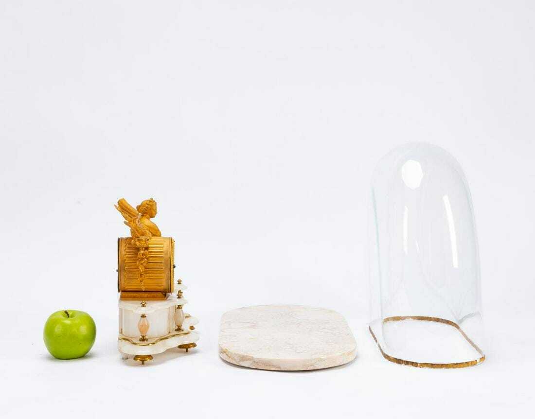 areas of scratches to onyx base; dome and marble base associated; small rough area to edge of marble base; rough edge to dome with loss of gilding with no apparent chips.