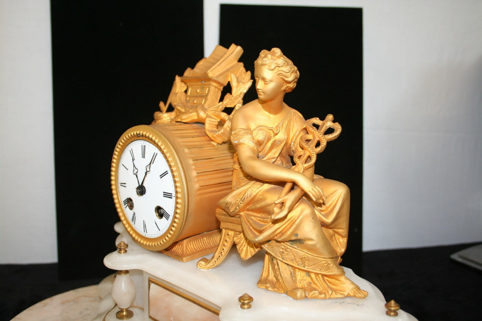 Lenzkirch (German, 1850-1932), 1872. French Gilt metal figural clock, modeled as Rhetoric holding a caduceus, Lenzkirch movement with enameled dial, on a shaped white and rose onyx base, with colorless glass dome, and marble platform.