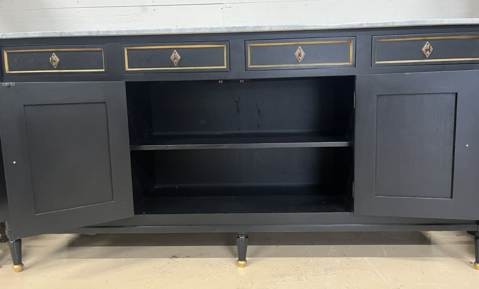 This French Louis XVI sideboard cabinet features a black color with a marble top and gold accents.