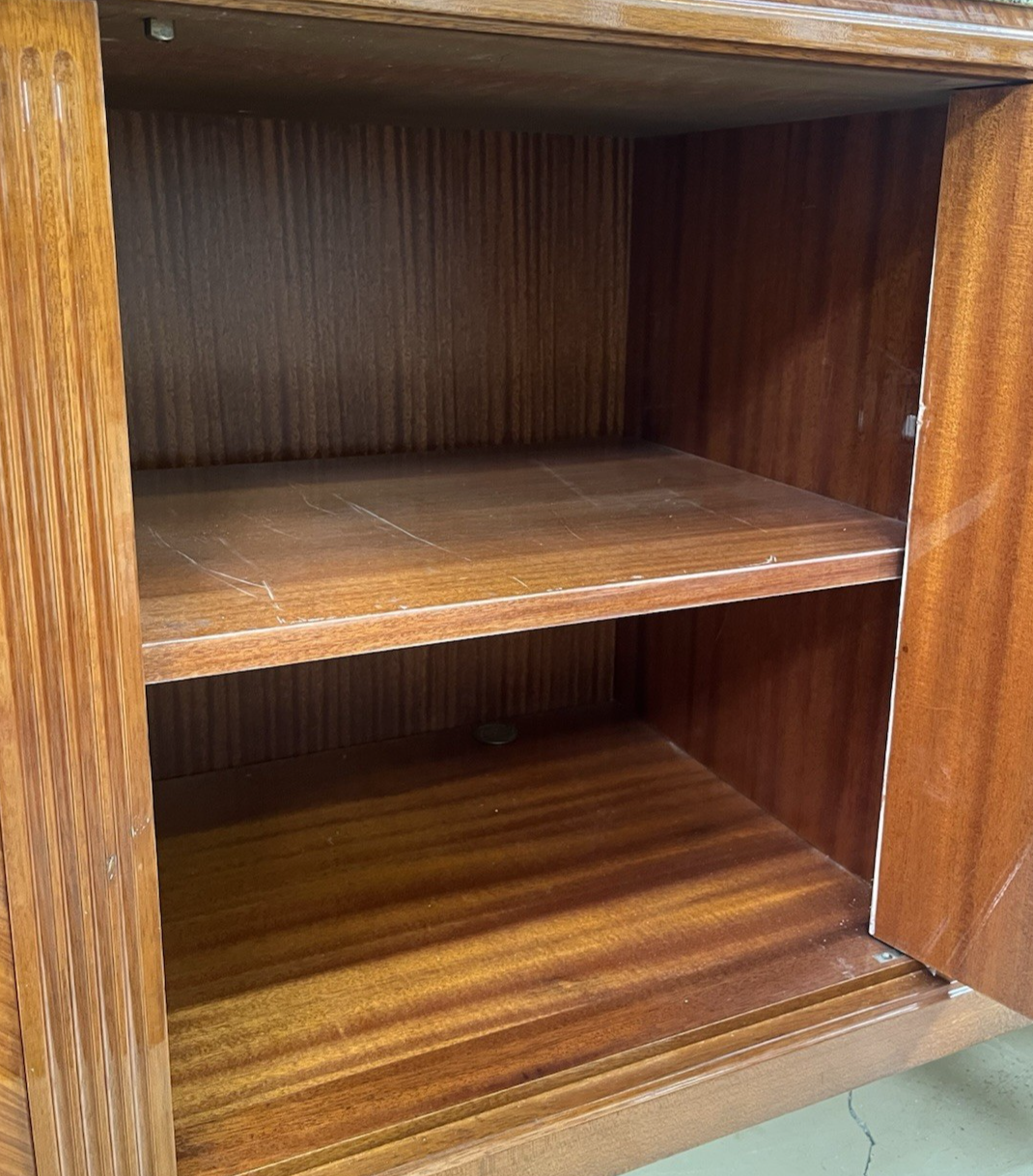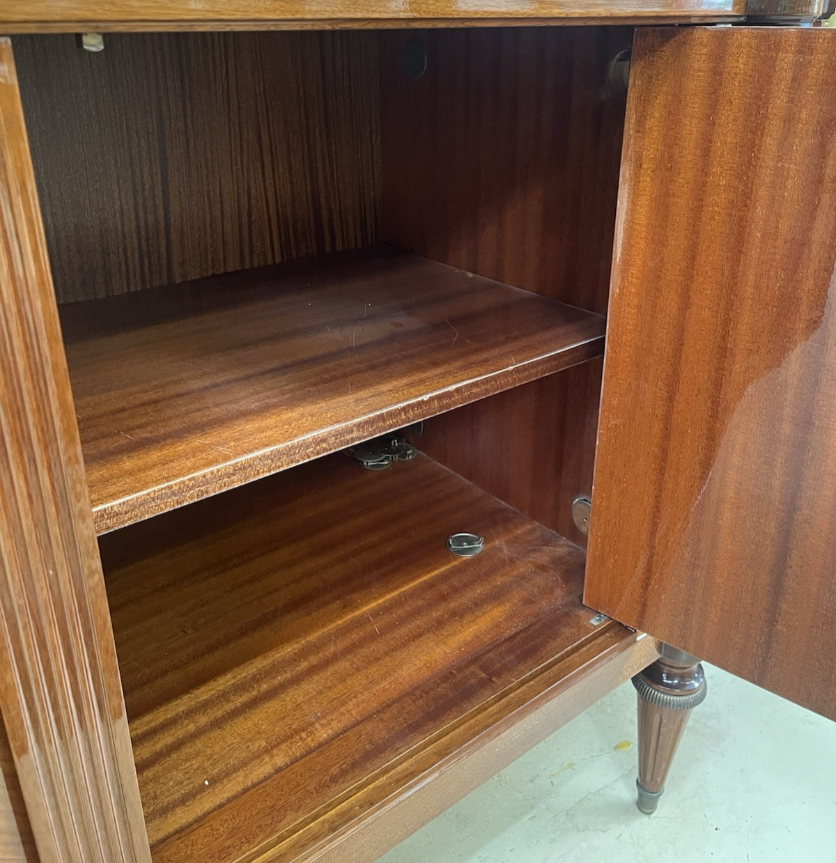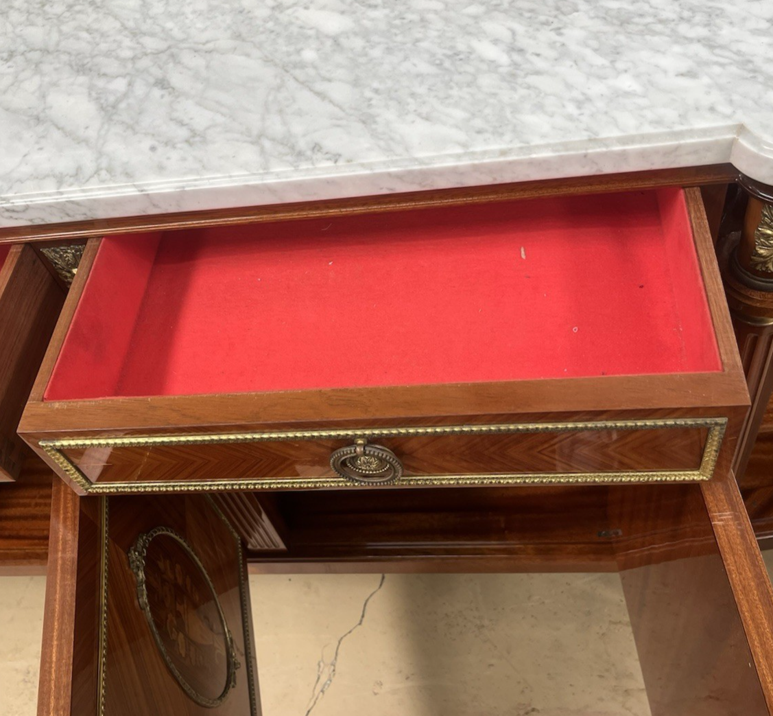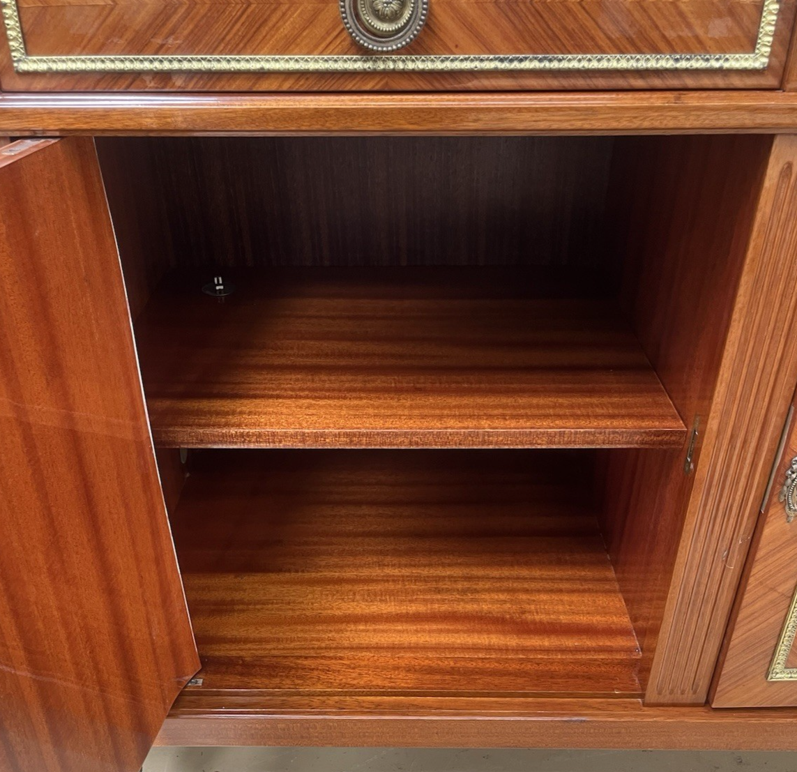 French Louis XVI style lacquered marquetry sideboard, 20th c., having shaped marble top, over conforming matched veneer case, fitted with five drawers and five cabinet doors, with inlaid flowers and urn motifs, curved cabinet at either side, one being a bar cabinet with two glass shelves against mirrored backsplash, bar cabinet lighting in need of wiring, accented by gilt metal beaded trim, rising on tapered legs, ending on brass cap feet, approx. 40"h, 105"w, 21.5"d