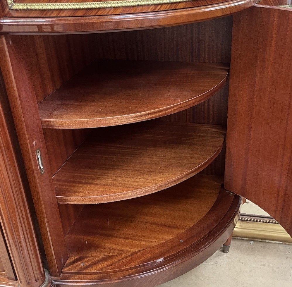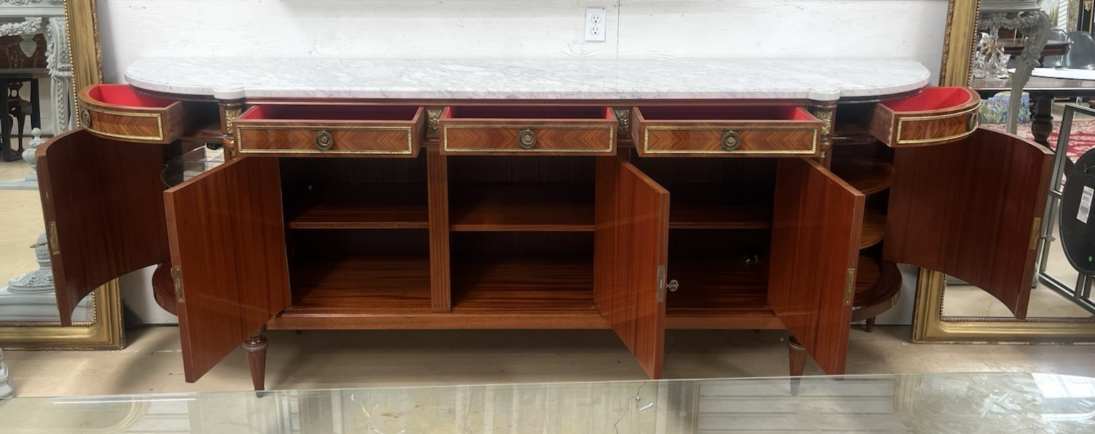 FRENCH LOUIS XVI MARBLE-TOP LACQUERED MARQUETRY DEMILUNE ENFILADE SIDEBOARD 105"