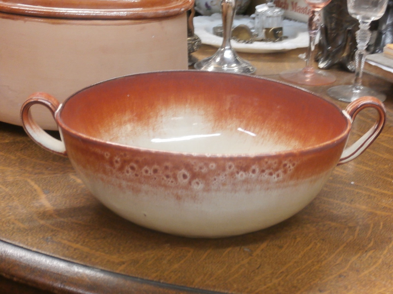 Offered for sale is a 2 handled handmade, wood kiln fired bowl bought originally in Vallauris, France (Provence). The bowl is beautifully glazed with red/brown and cream. It measures 12 " from Handle to handle with the bowl being 9 inches in diameter and 4 " tall. It is in perfect condition with kiln marks on the bottom. Check out my 3 other listings for Vallauris pottery: casserole w lid, 9 " and 11" ruffled pie plates. All these items were purchased at one time by a wealthy woman about 30 years ago on one of her tours through Provence. The bowl has no marks, however, needs none since this pottery is distinctive to this part of France. The large casserole is the only marked piece of the 4 and it is stamped Bazar Francois, Vallauris, France.