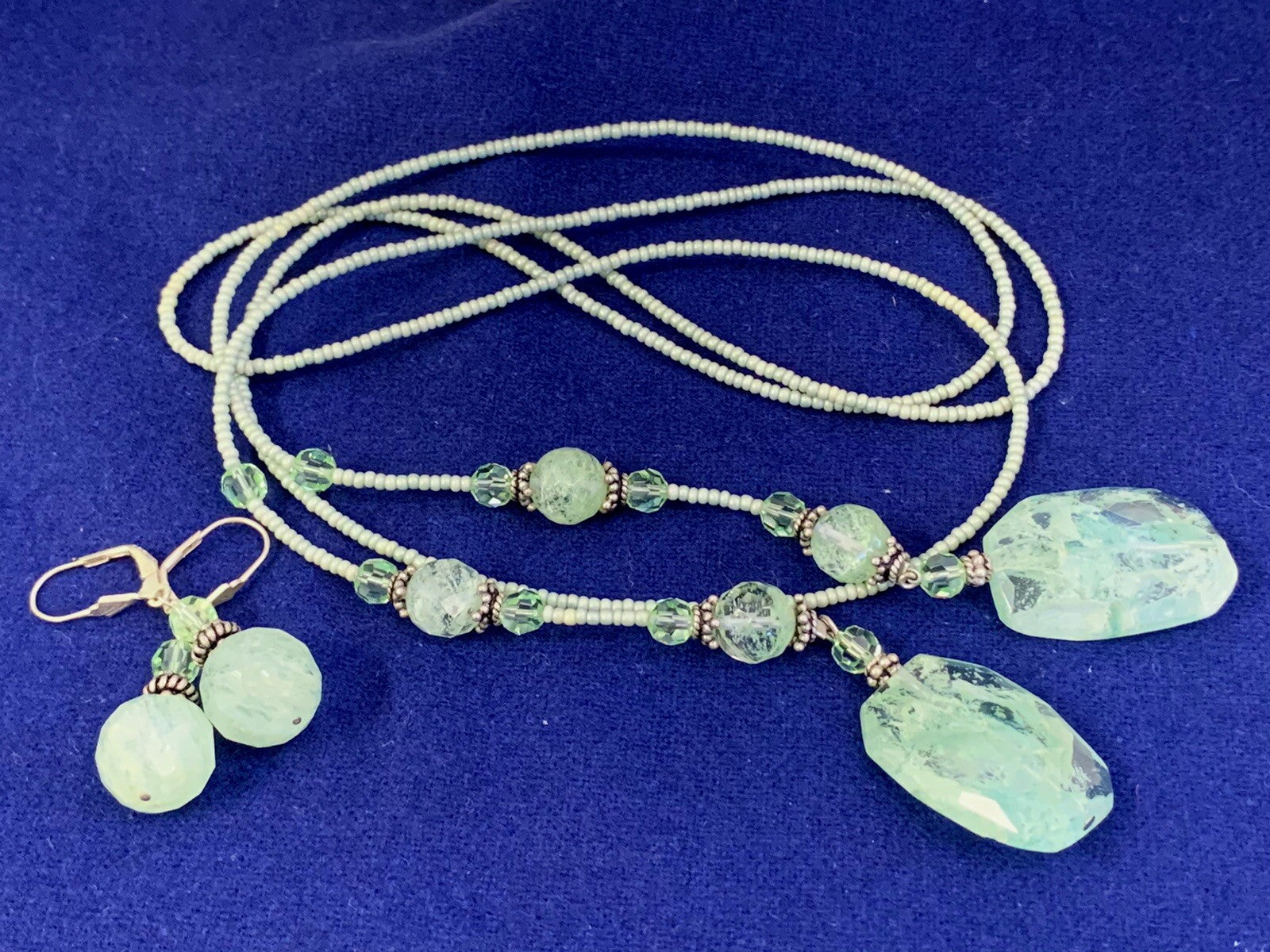 Offered for sale is a 46" mint green glass lariat necklace and matching pierced lever back earrings. Purchased from an estate-never worn. Great gift set! Excellent condition.