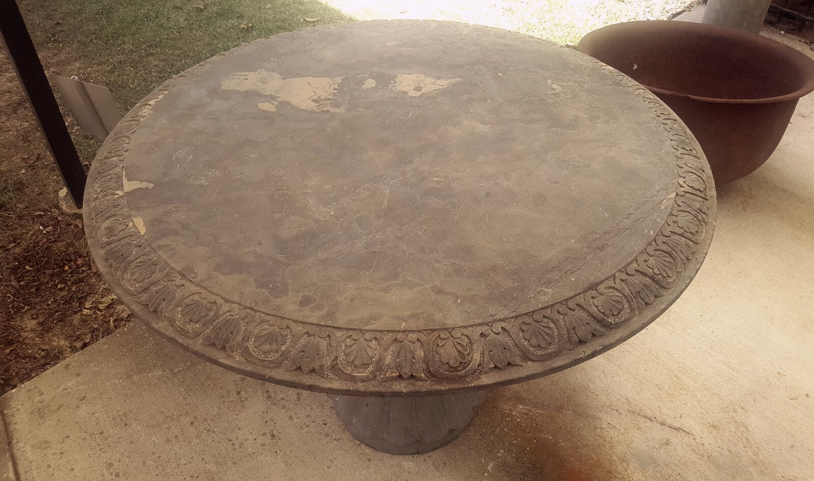 Offered for sale is a round gray marble pedestal table that is 47" diameter x 32.5" high. Study the pics to appreciate the carving on the table edge and the carved shaped pedestal. This table is very substantial-heavy and in a excellent condition. All marble is original and in great shape-no chips, breaks or repairs. This marble was quarried and the color changes are the way it came out of the ground-all natural. This would be great as a center table in a foyer, or the patio, kitchen-any room.