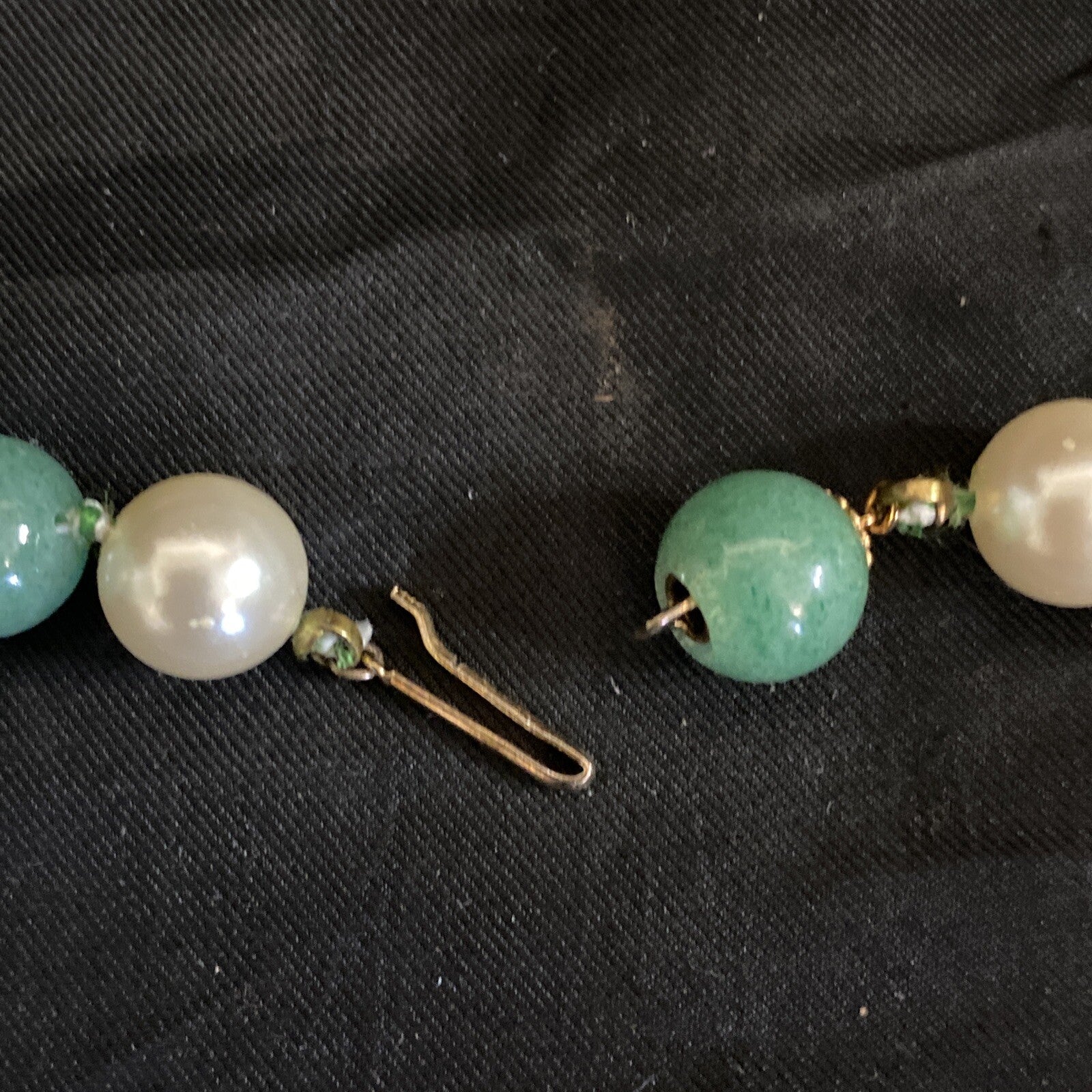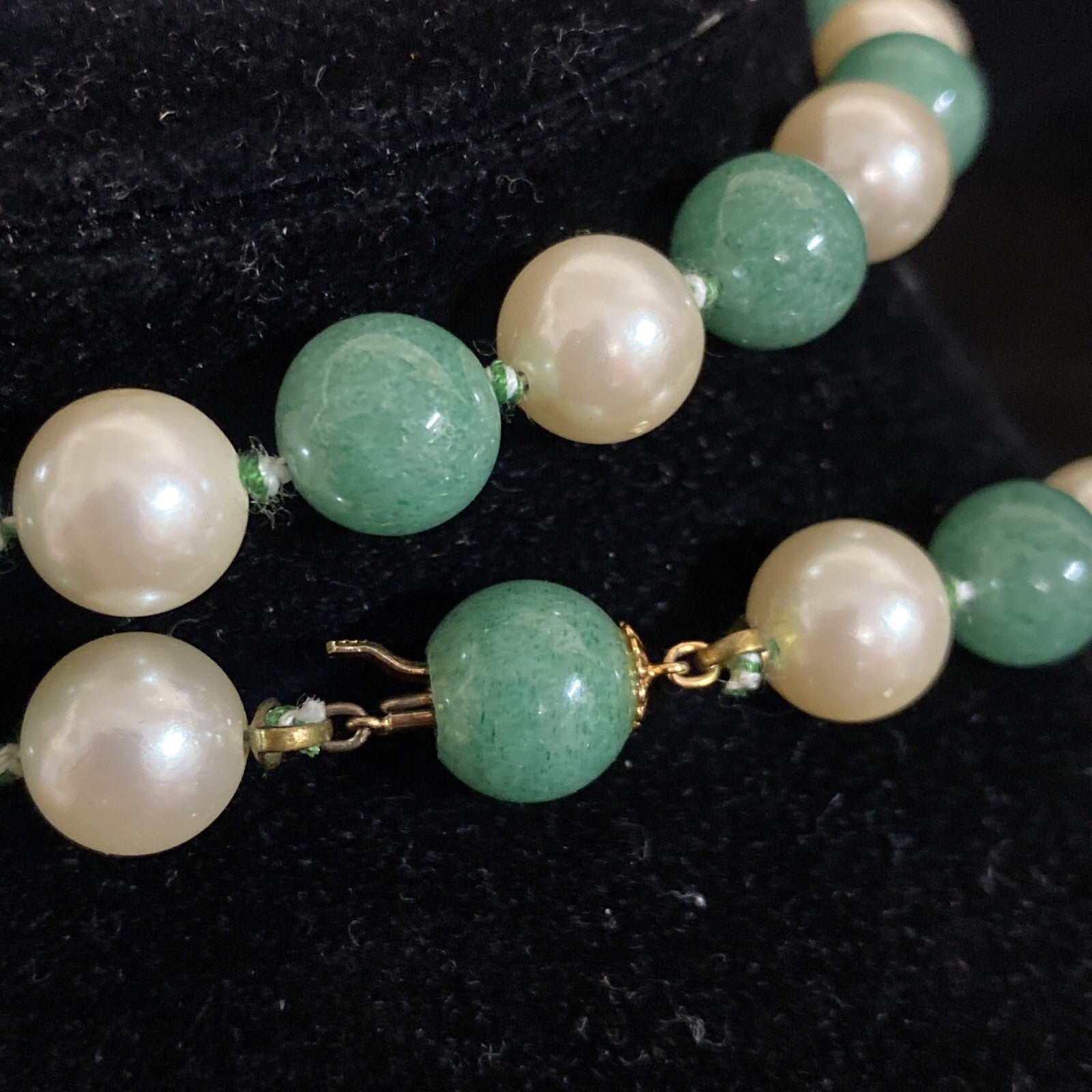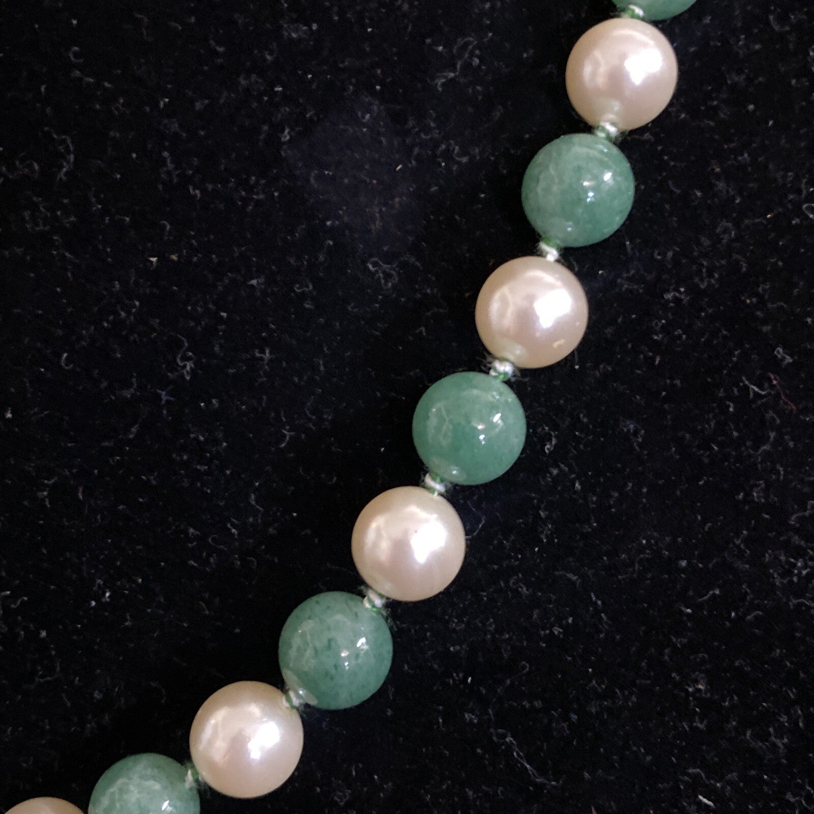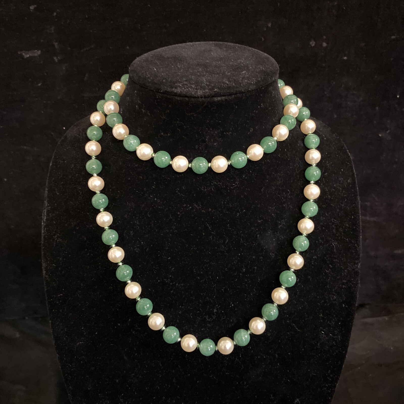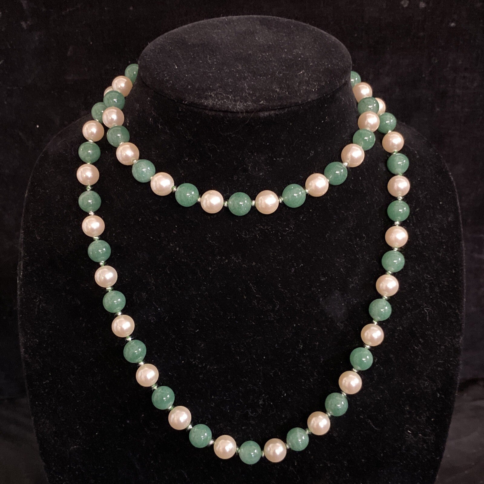 Hand Knotted Simulated Pearl & Aventurine Beaded Necklace 36" 9.5mm