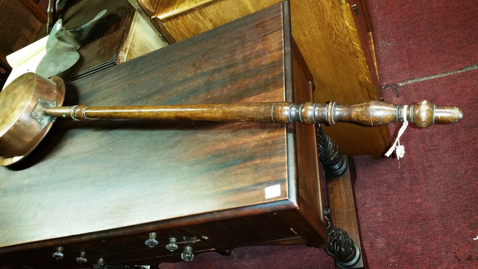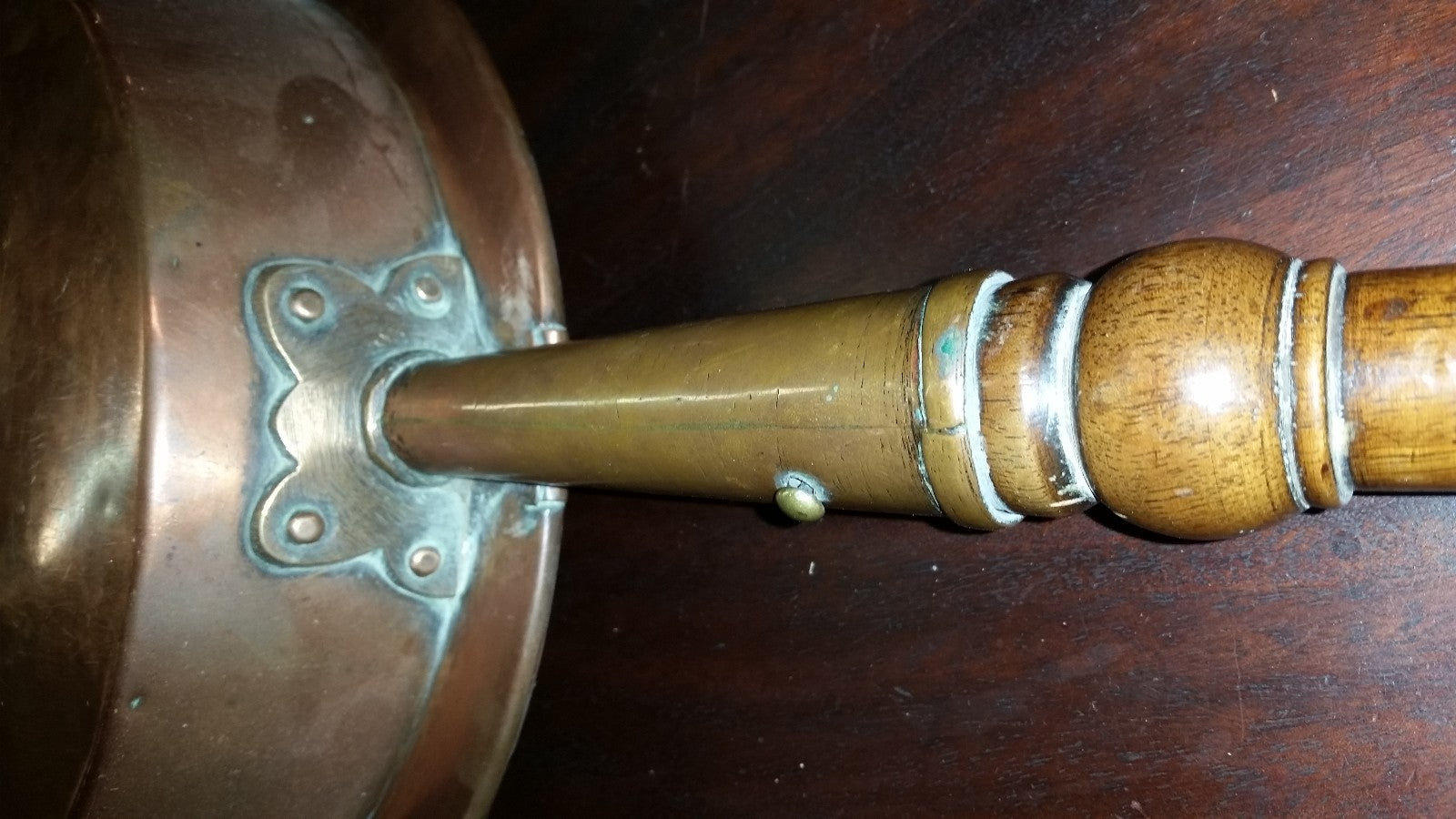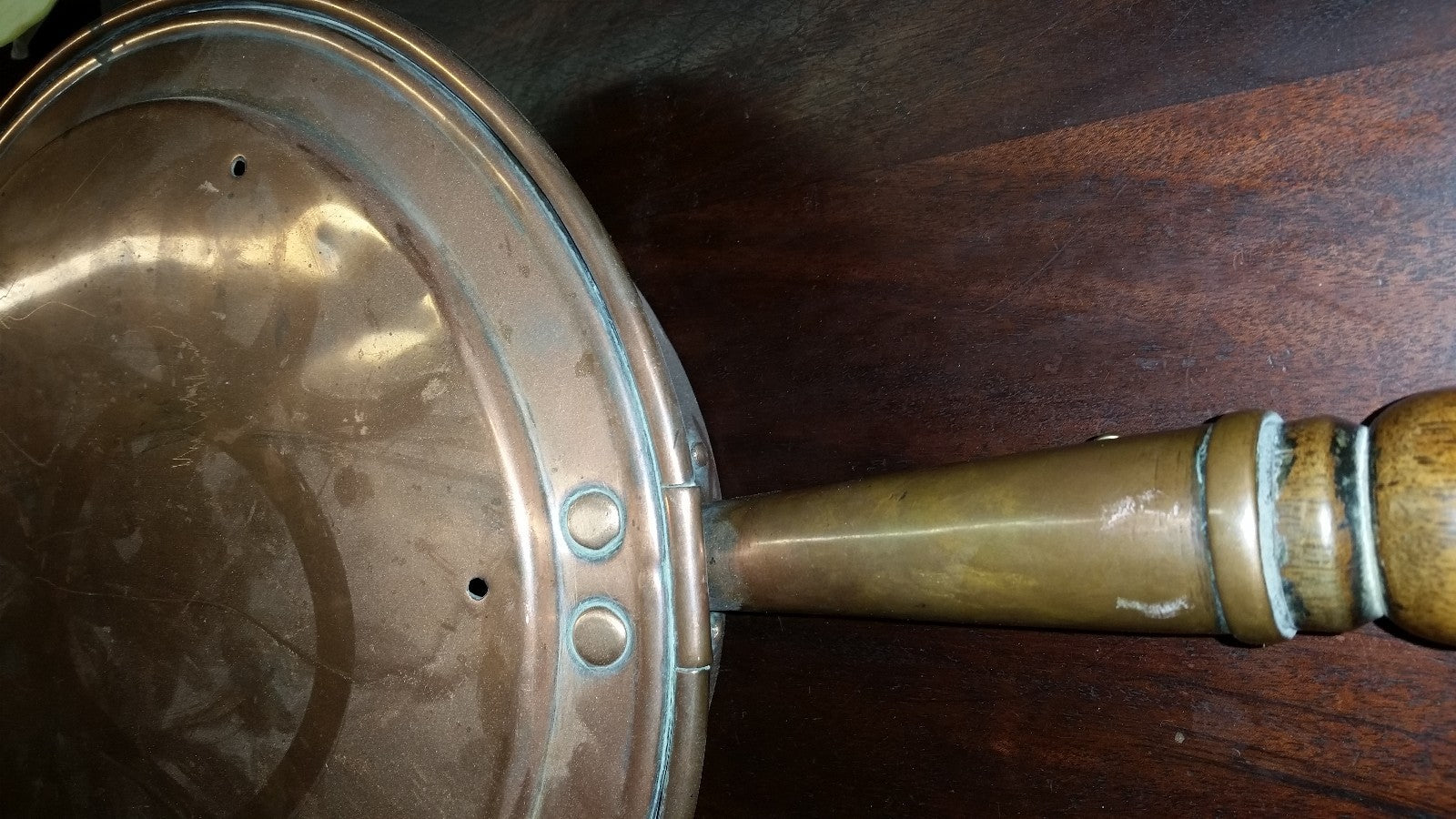 Offered for sale is an antique copper bed warmer that is 45" long. The pan is 11 " diameter ,3" deep and weighs 4 lbs. When the lid is closed, it is 3 3/4" deep. This copper is heavy with beautiful hand made craftsmanship. I tried to show the pattern of decoration on the lid, however it is faint after all these years. We bought this in Europe on a buying trip. It dates to the early 1800's. Note the handmade riveting and workmanship. Amazing , excellent condition for its age.