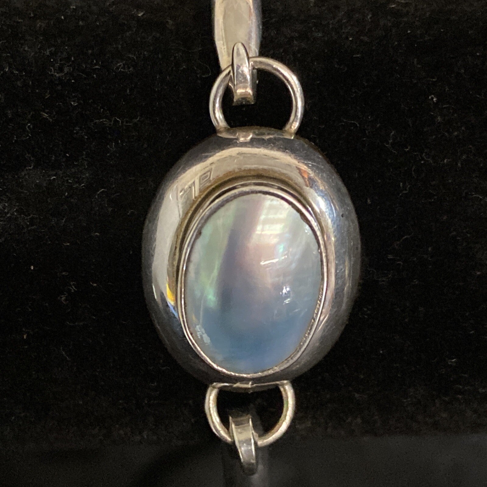 Offered for sale is a handmade vintage sterling silver bangle bracelet with a large gray moby pearl.