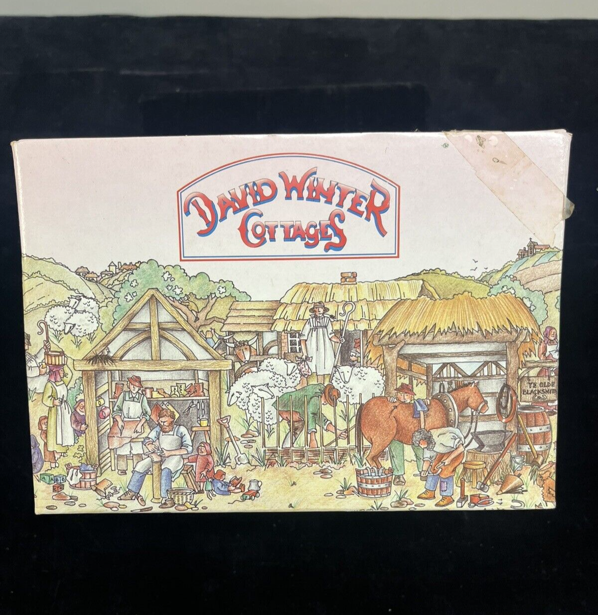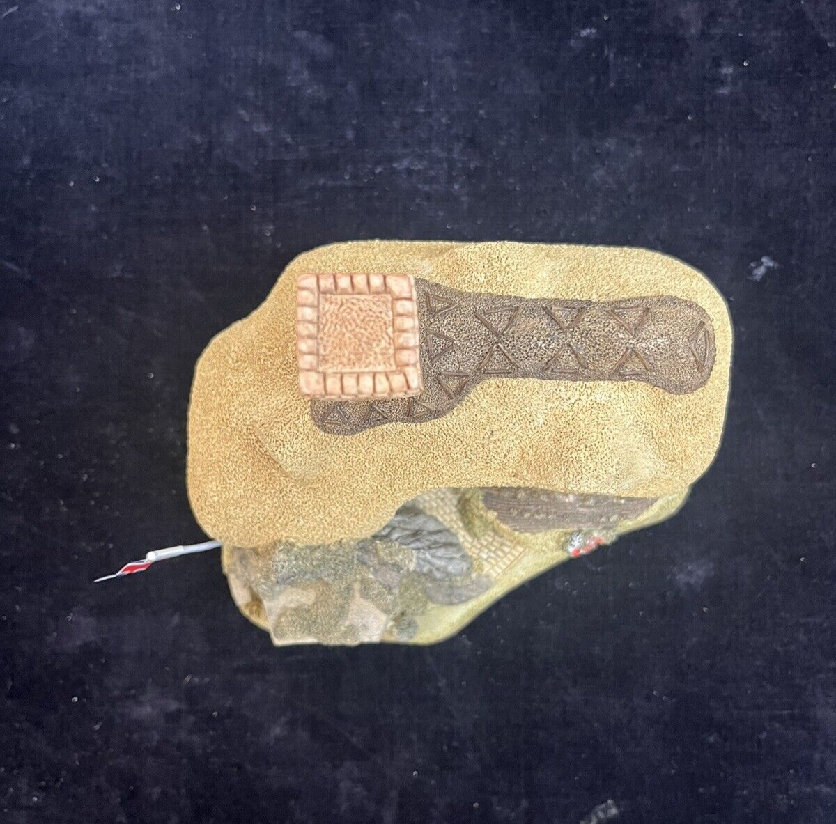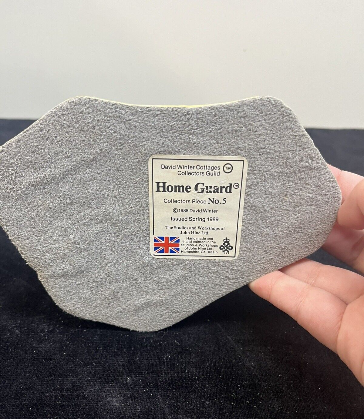 This is a medium-sized asymmetrical house sculpture titled "Home Guard" from the 1989 David Winter Collectors Guild. Handmade and textured, it features a British style cottage design with a Home Guard character theme. The multicolor piece is made of resin and ceramic, hand-painted and boxed, suitable for any room. It comes with the original box and a Certificate of Authenticity.