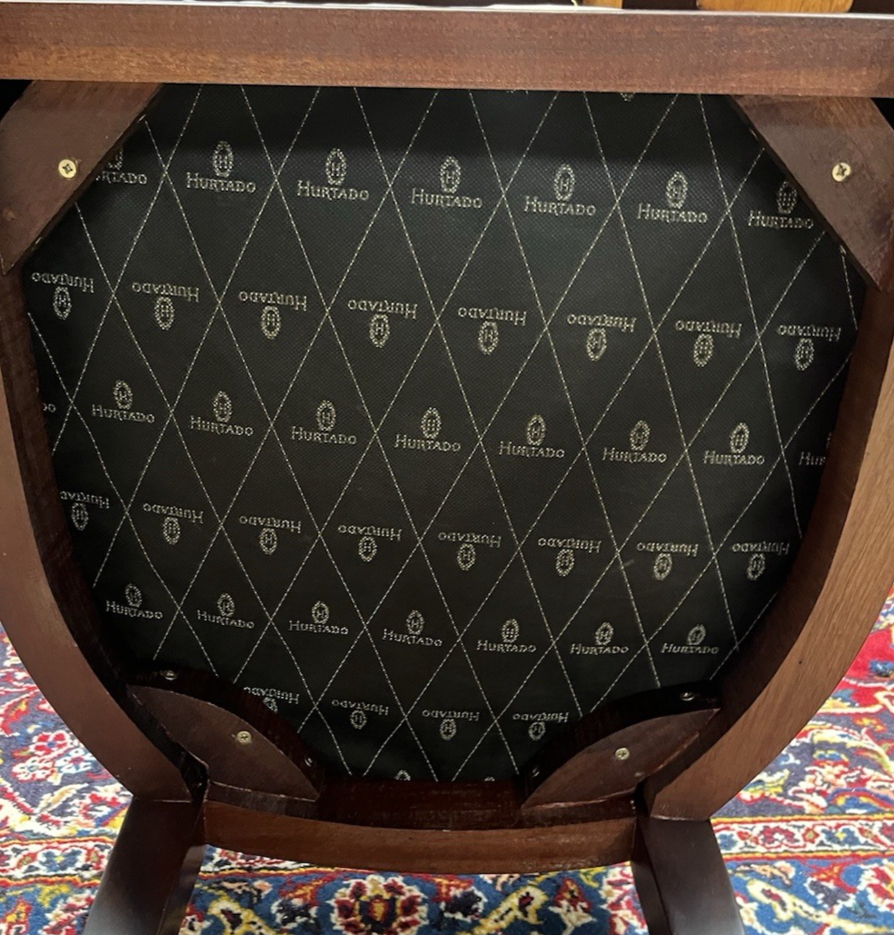 The Hurtado "Gala" French Modern Mahogany Dining Table is a stylish and elegant dining set perfect for any dining room. This set includes a rectangular dining table with 2 leaves and 11 chairs, providing seating for more than 8 people. The rich brown color and mahogany material add a touch of sophistication to your dining space. Add this set to your home to impress your guests and create a warm and inviting atmosphere for meals and gatherings.