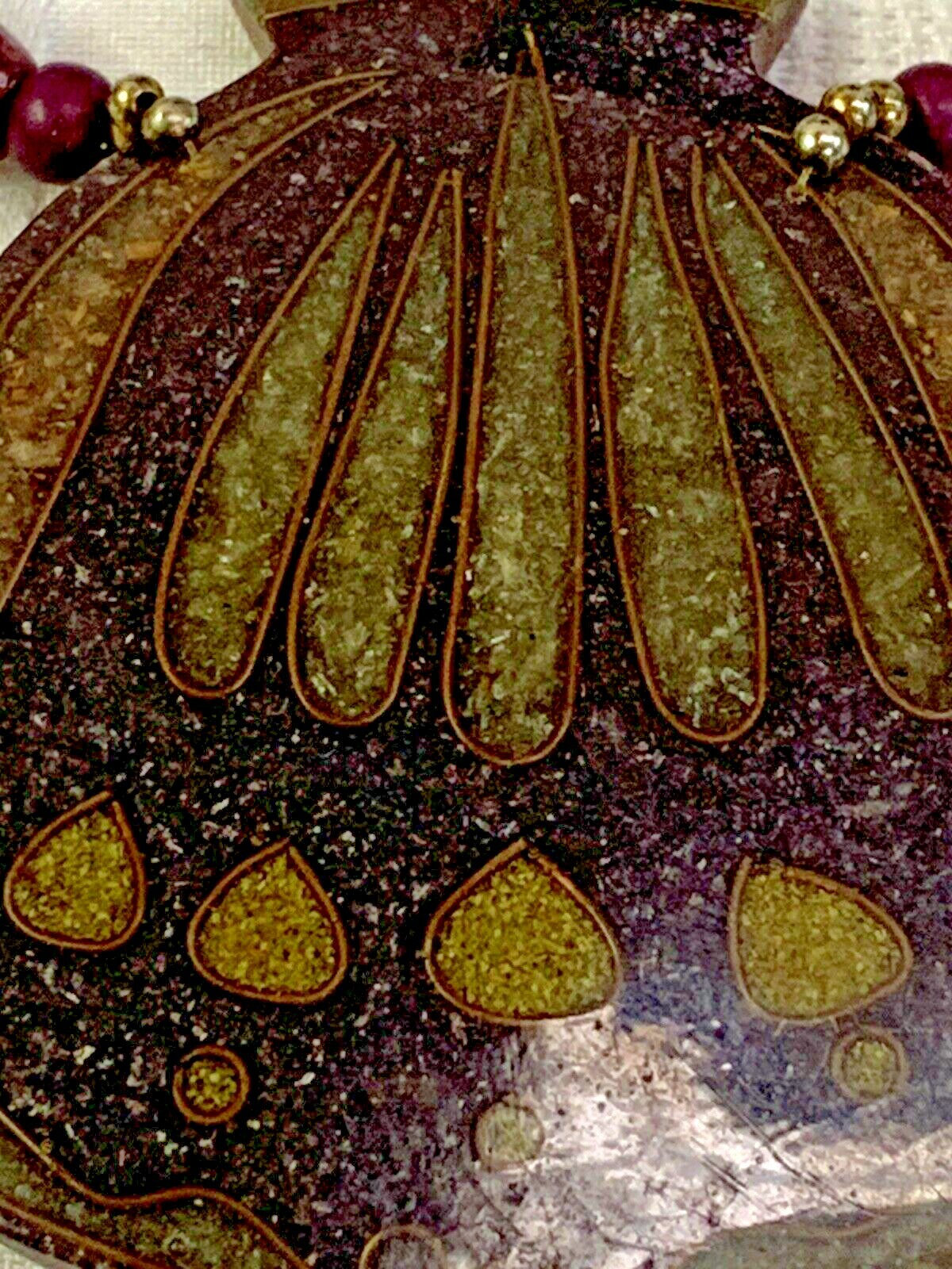 Inlaid Epoxy Resin Flower Necklace Natural Burgundy Beads. Measures 25" end to end.Pendant measures L 3 1/4" W 3 1/2"