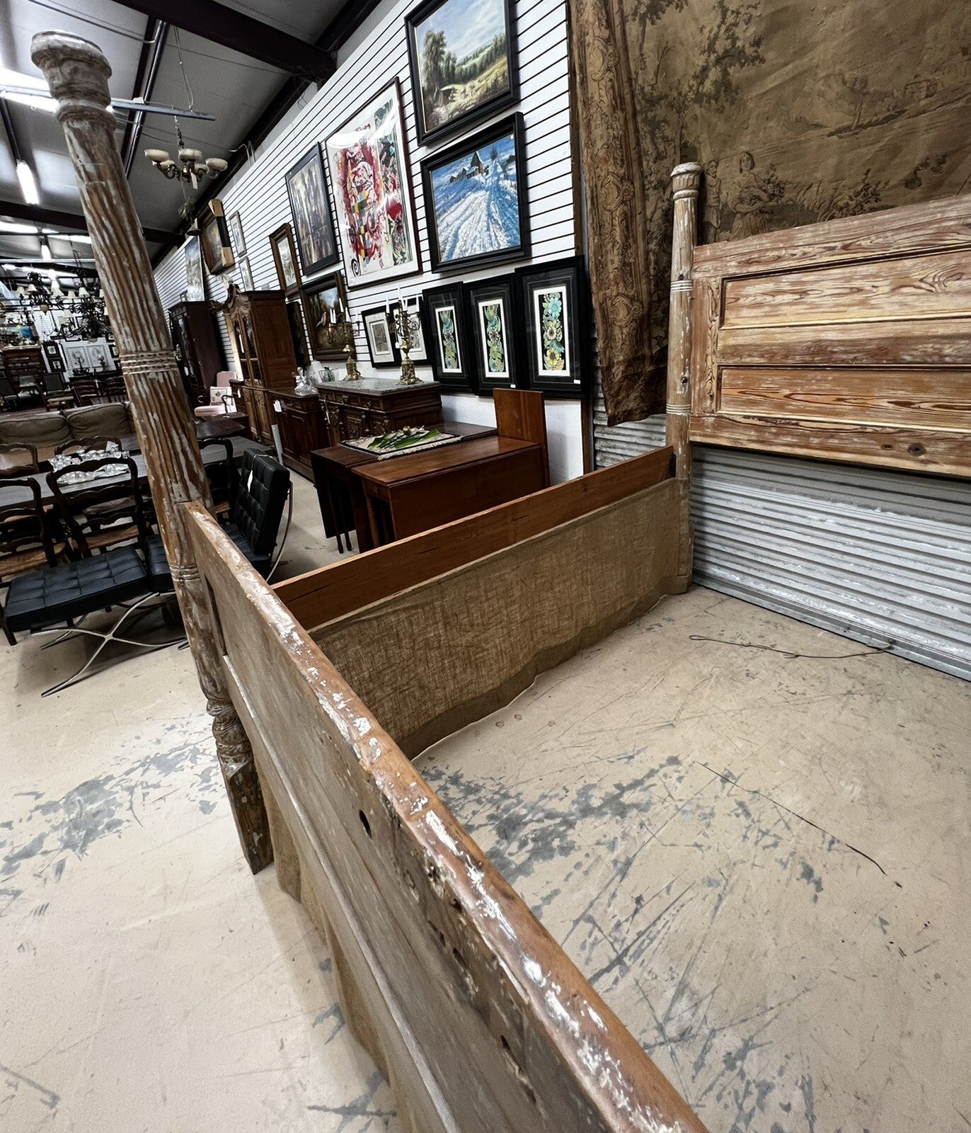 Offered for sale is a handmade king size bed made from porch posts and 2 doors from.an antebellum home in historic Eufaula, Alabama. H 82" x W85 x L 92" Inside measure w 79" x l 82", Height of headboard 68" Height of footboard 44.50" The bed skirt is burlap velcroed to the frame. You could change the bed skirt to any fabric. The first pic shows it as set up in the last owner's home. Excellent condition.