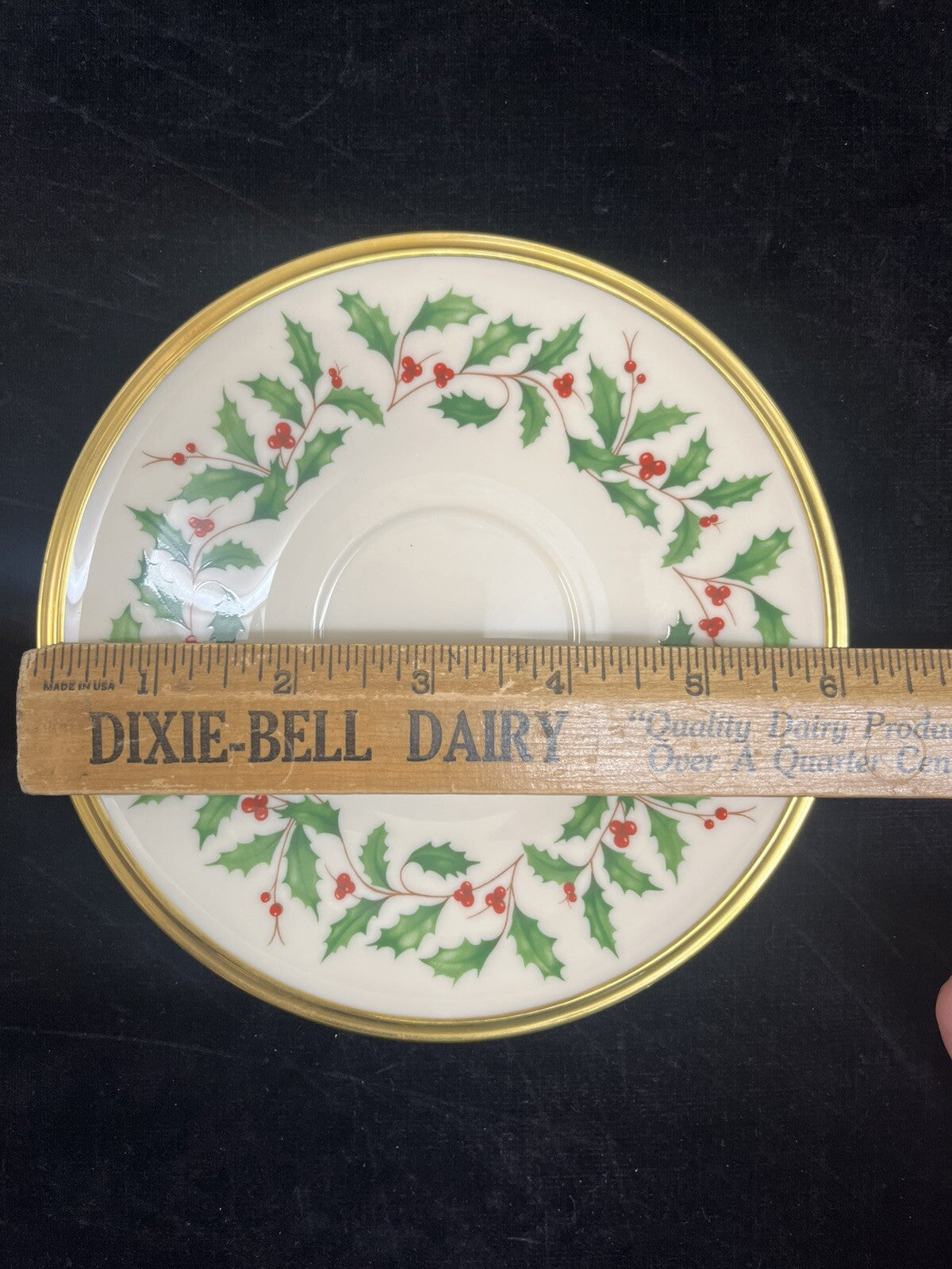 The Lenox Ivory China Holiday Tea Cup and Saucer features a festive design with holly berry and a gold rim, perfect for Christmas occasions. The set includes a tea cup with a diameter of 4.75 inches and a height of 3 inches, along with a saucer measuring 6.25 inches in diameter. This elegant tea cup and saucer set is made in China and is ideal for serving tea in style during the holiday season.