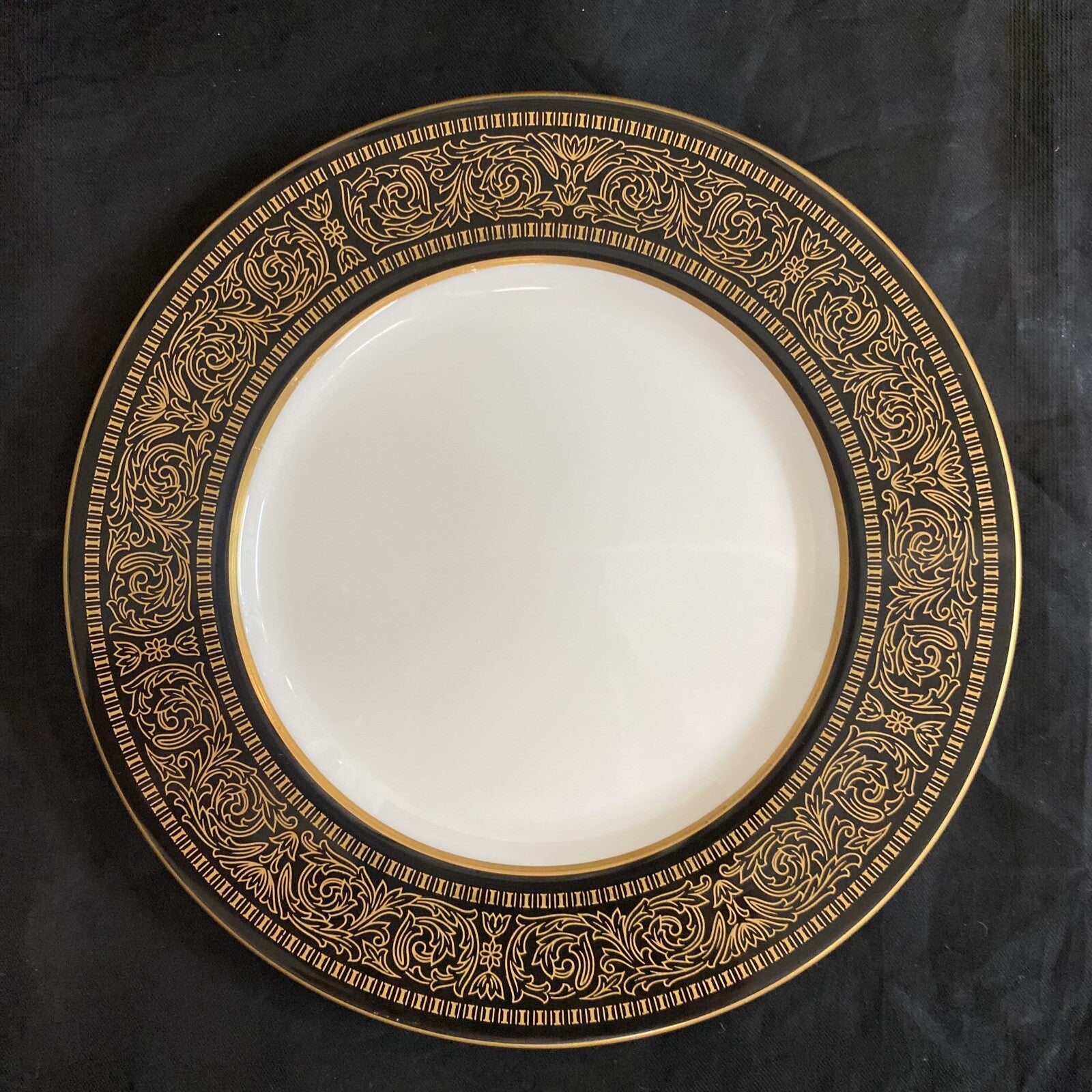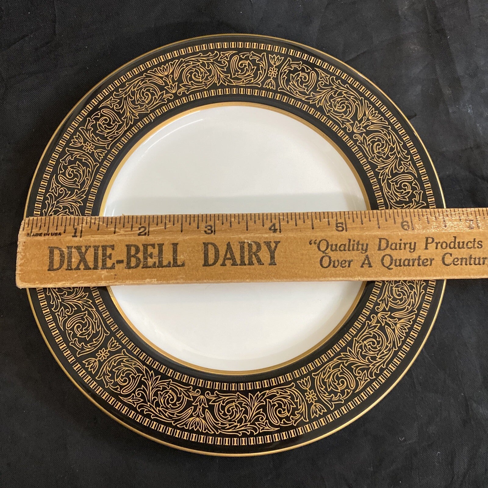 This Mikasa Bone China Mount Holyoke bread and butter plate is a beautiful addition to any dinnerware collection. The plate features a stunning design of gold flowers and scrolls on a black band, with a round shape and a glossy finish. Made of ceramic material and manufactured in Japan, the plate has a printed backstamp and is perfect for any occasion.