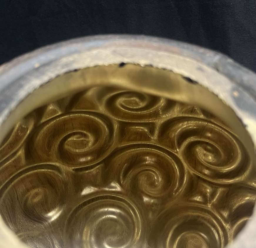 The glossy finish and abstract art subject make it a unique addition to any collection or as a standalone statement piece. With a mouth diameter of 6 inches and a substantial weight, this unmarked glass sculpture is a testament to skillful craftsmanship and design, sure to evoke admiration and discussion about its abstract theme and the art glass production style.