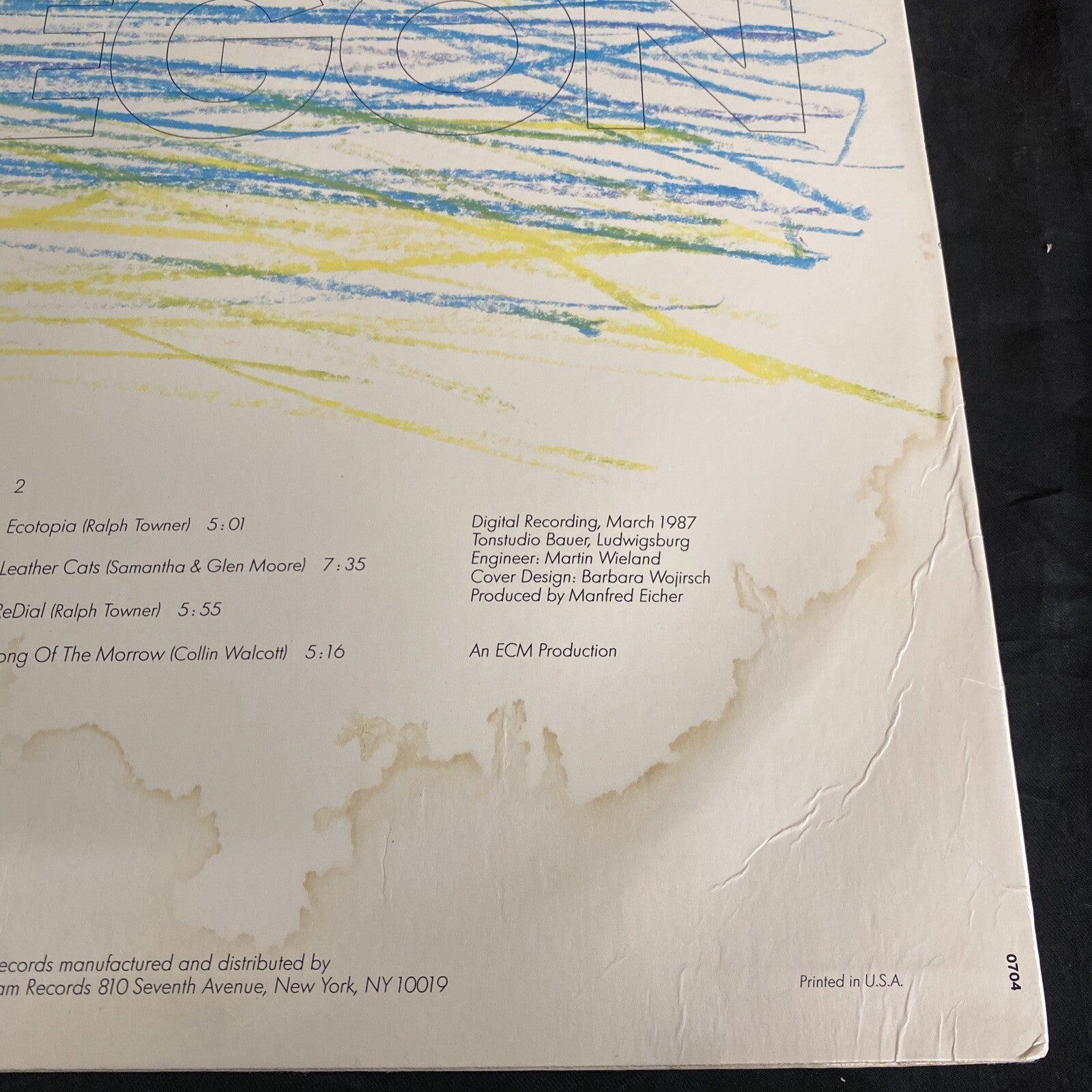 This is a vinyl LP titled "Ecotopia" by the jazz group Oregon, released in 1987 by ECM. The album features Ralph Towner, Glen Moore, Paul McCandless, and Trilok Gurtu. The record is in near mint condition and comes in a cardboard sleeve with the original cover. It is a first edition pressing from Germany with a catalog number of ECM 1354. The LP has stereo audio channels and plays at 33 RPM.
