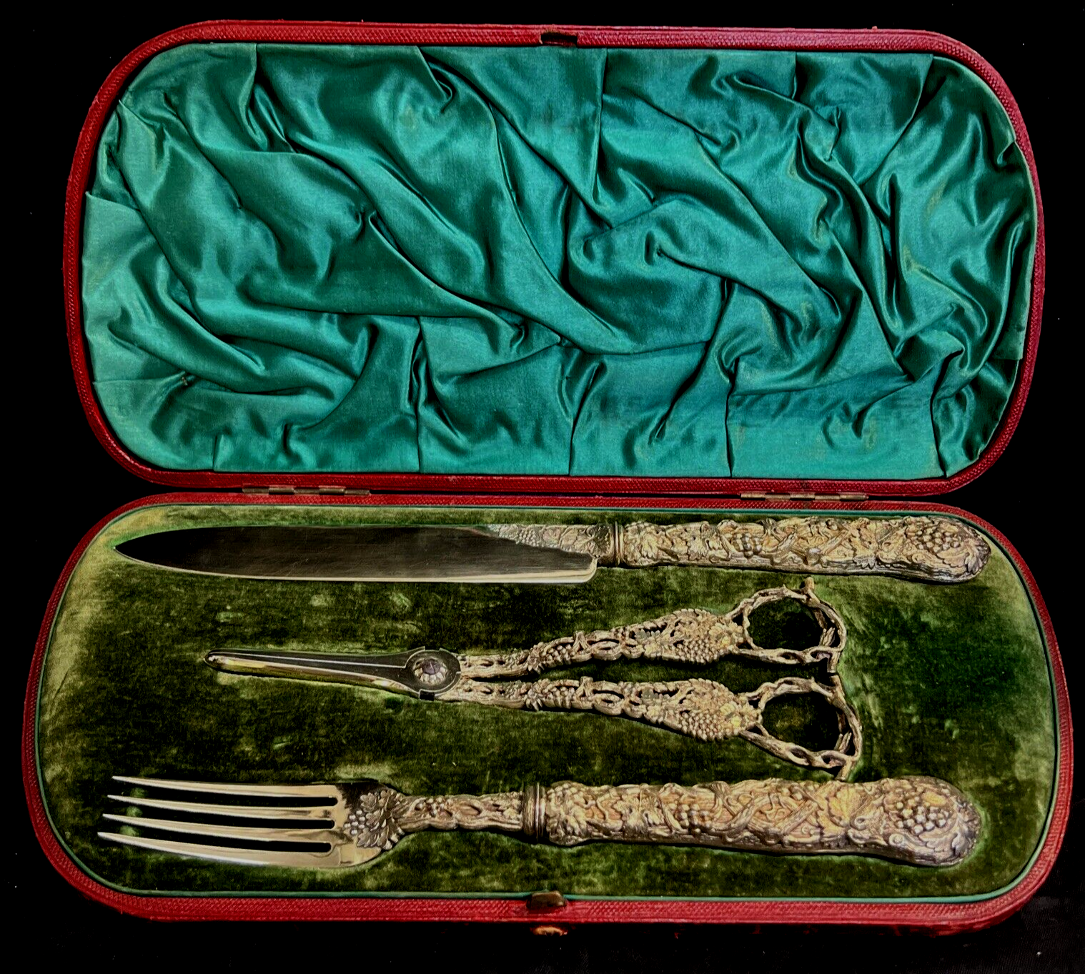 Offered for sale is an ornate sterling silver Gilt 3 Piece Dessert Set by Francis Higgins of London in 1896 . The set is covered in a chased vine pattern made to the highest standaards in the world. Francis Higgins, London silver maker, was born in 1818 and died in 1908. Francis Higgins & Son rose to great prominence in the silver trade for the quality and ingenuity of their work as specialist spoon and fork makers. They first produced this pattern for the Great Exhibition of 1851. It is now recognized as one of the most extraordinary silver flatware patterns in the world. The high quality of his work is reflected by the fact that most of it was sold retail by Garrards and Hunt & Roskell, both royal jewelers. This beautiful set is in its original fitted presentation box. It is an heirloom piece ready to be passed too the next generation. A perfect wedding cake knife, large fork and grape scissors.