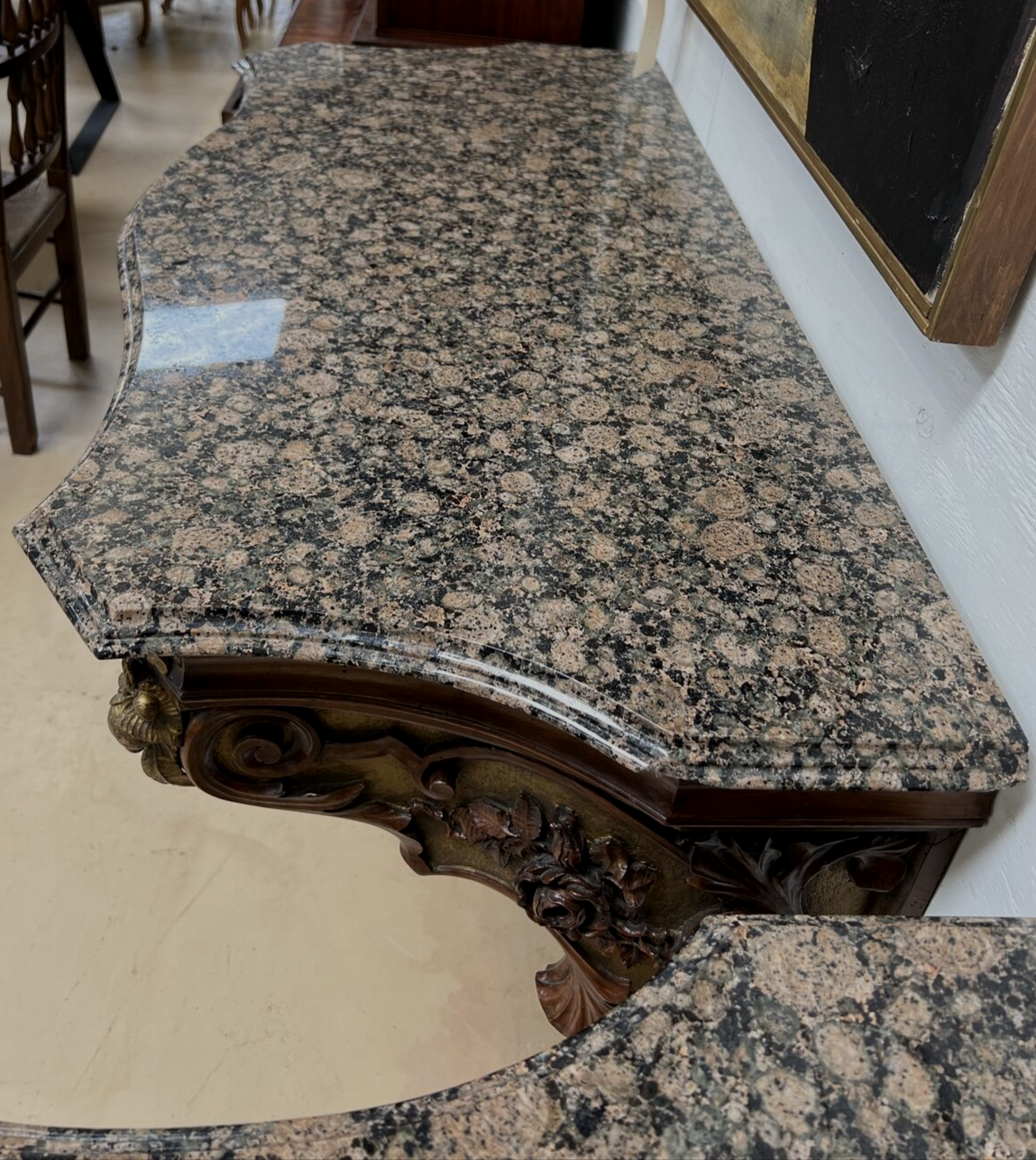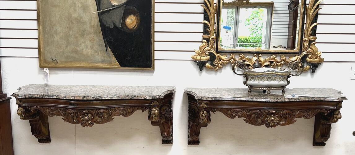 Pair French Rococo Carved Gilt Walnut Wall Mounted Consoles 47” Window Shelf
