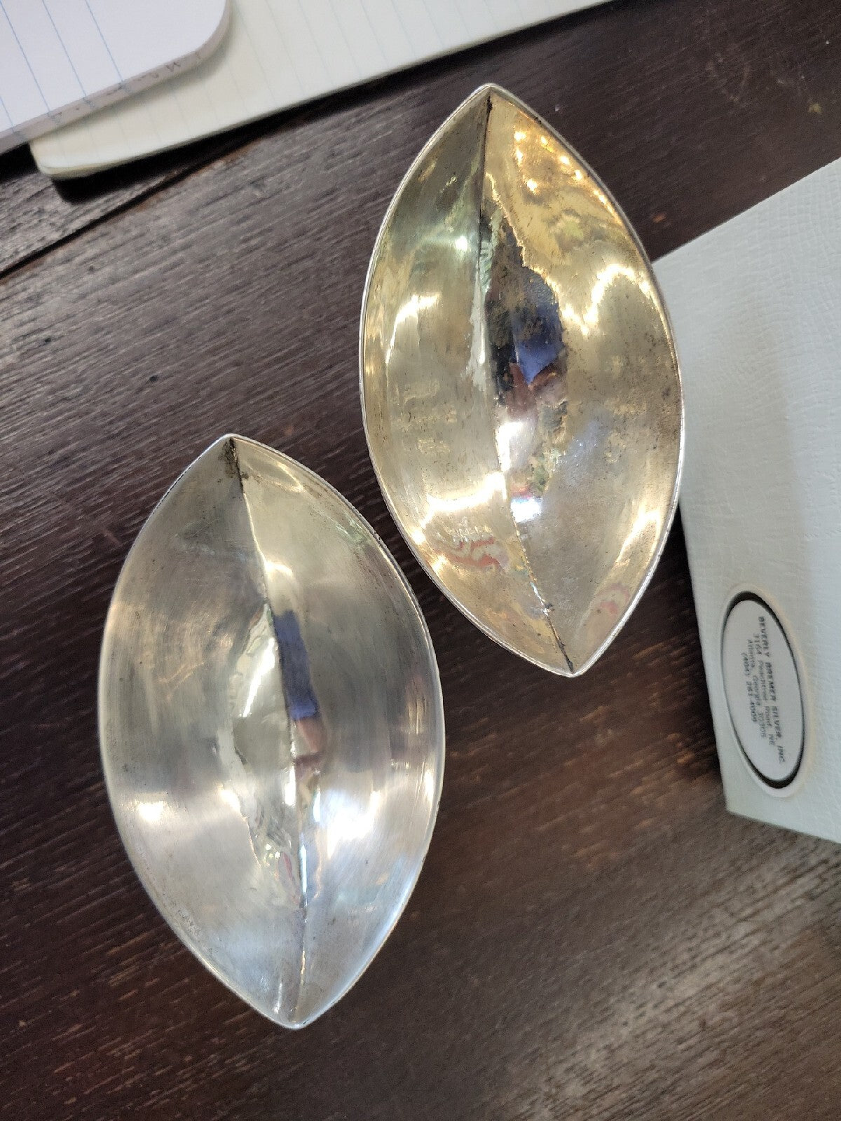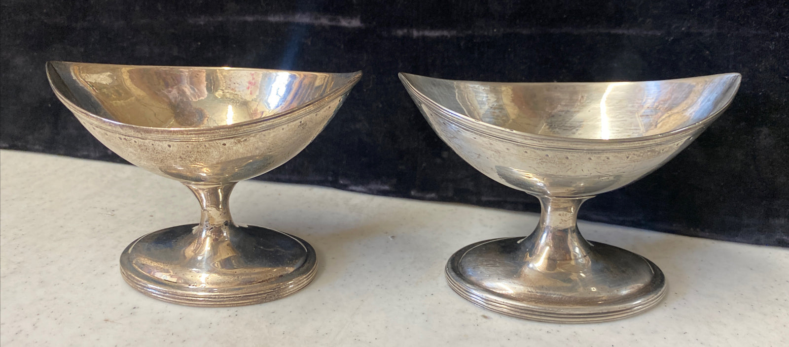 Offered for sale is a fine pair of sterling silver boat shaped pedestal salt Cellars. Hallmarked for Dublin , Ireland , 1761 (N in a 3 tipped shield,) total weight is 125 grams. Excellent for age.