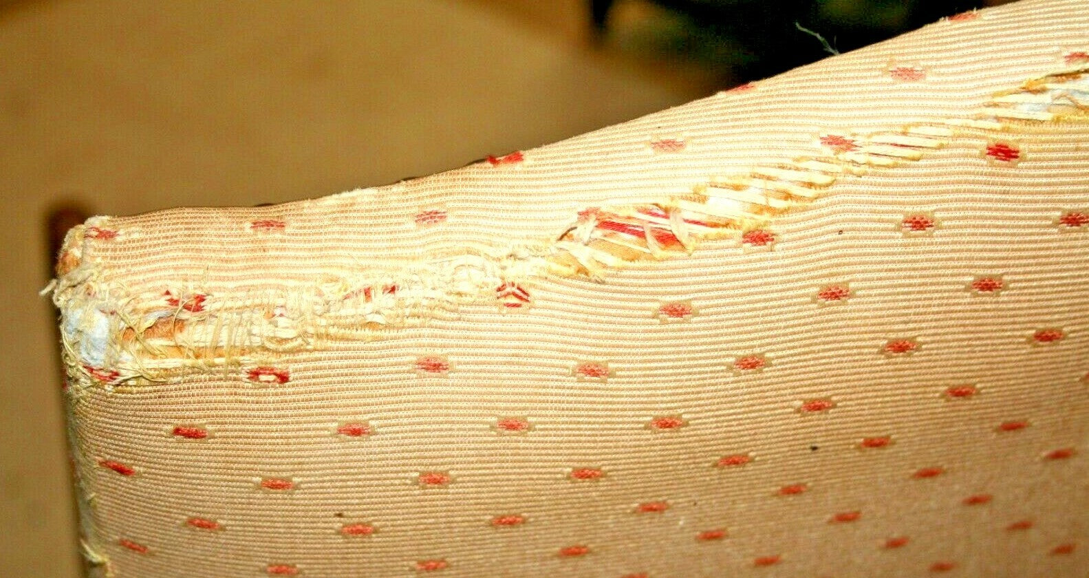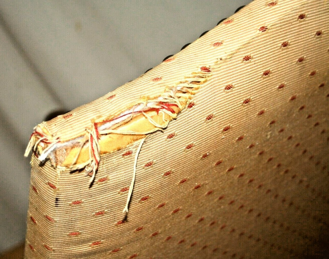 Offered for sale is a pair of Sheep Bone (in French they are called: os du mouton) walnut armchairs with studded gold upholstery . The chairs are sturdy and wood looks great. The upholstery on the top left back of each chair is frayed ( looks like cat is culprit). The backs of each chair could be replaced with a complimentary color of velvet or any fabric. Lots of designers monogram the backs when changed. The chairs are beautiful! They measure 46 1/4"h x 23 1/2"w x 35"d. Message for a shipping quote.