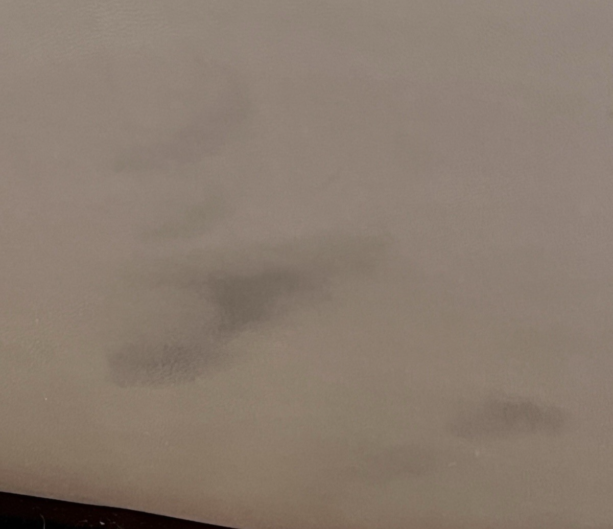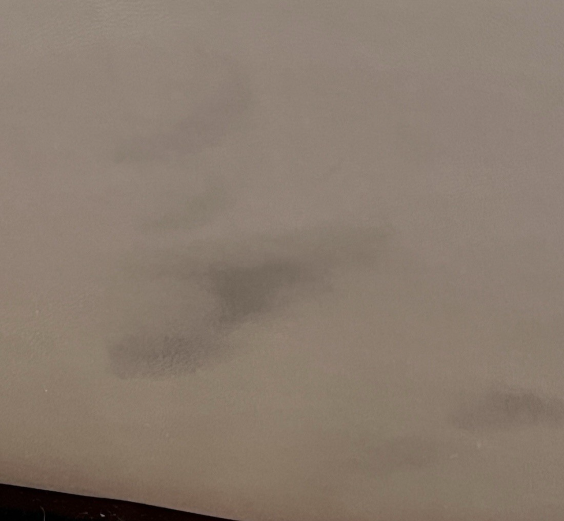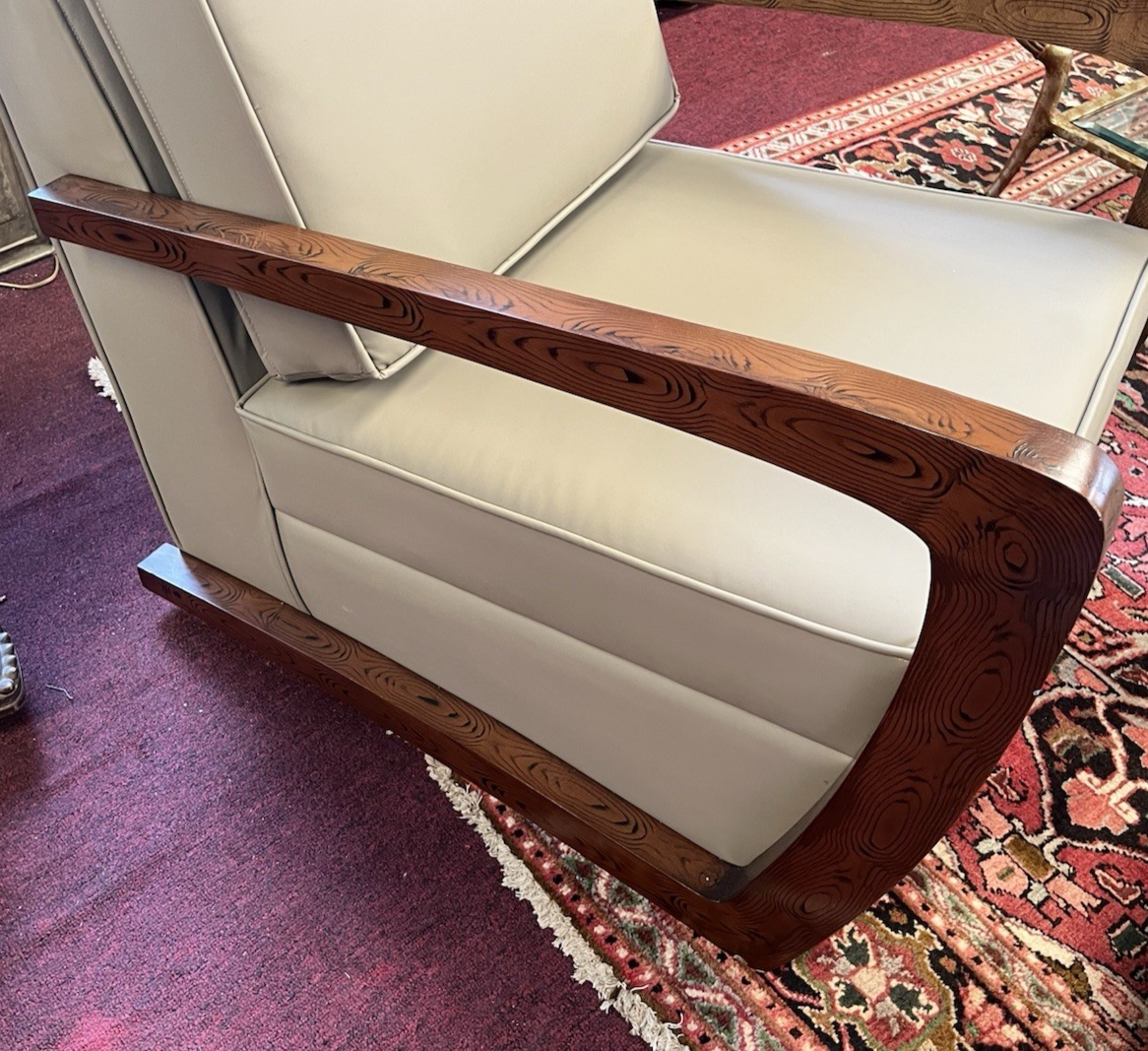 Pair of Art Deco style seating group, each having curvilinear frame, in beige upholstery, including: (2) armchairs, with removable back pillows, approx. 33"h, 28"w, 36"d, seat height: approx. 17.5"h; (2) ottomans/ footstools, approx. 18"h, 29"w, 22"d