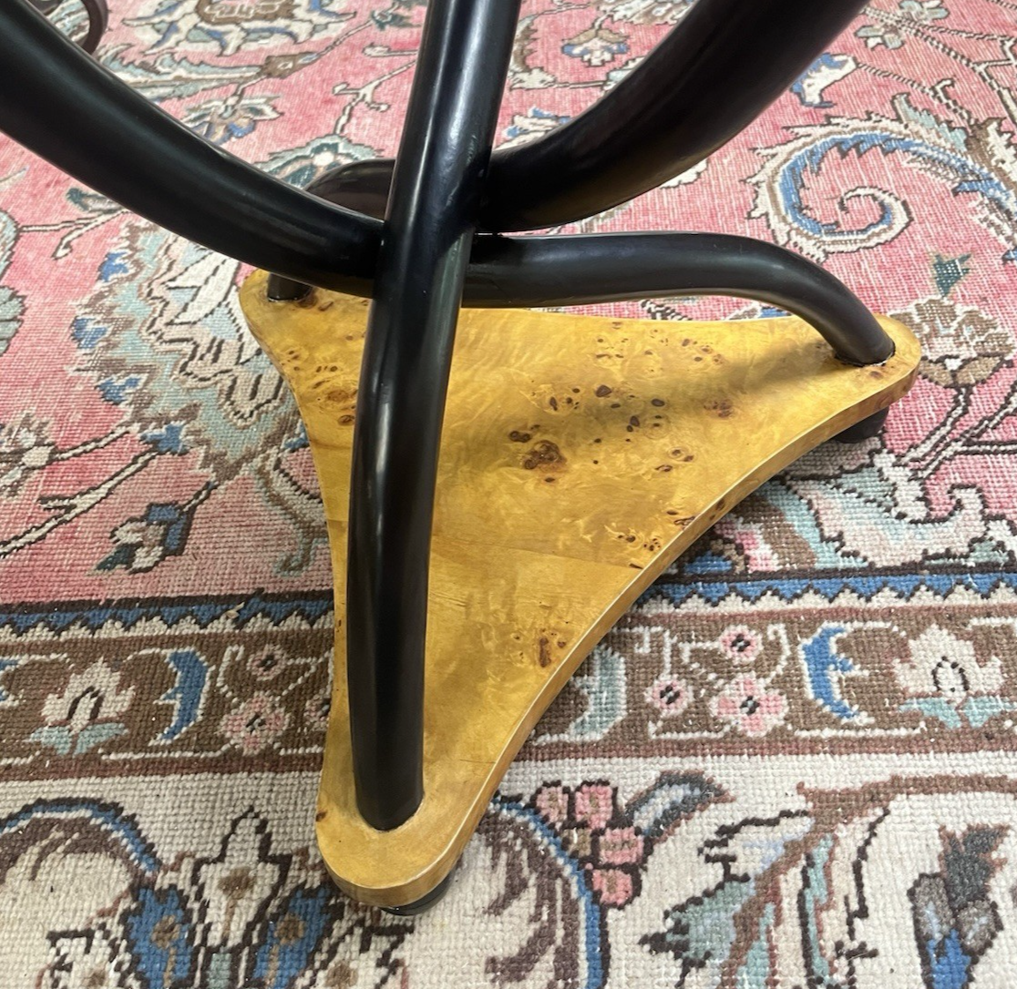 Pair of modern burlwood side tables, made of birds eye maple. Each fitted with frieze drawer, on ebonized organic shaped supports, approx 28.5"h, 17.5"diam