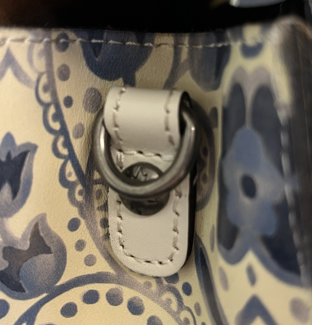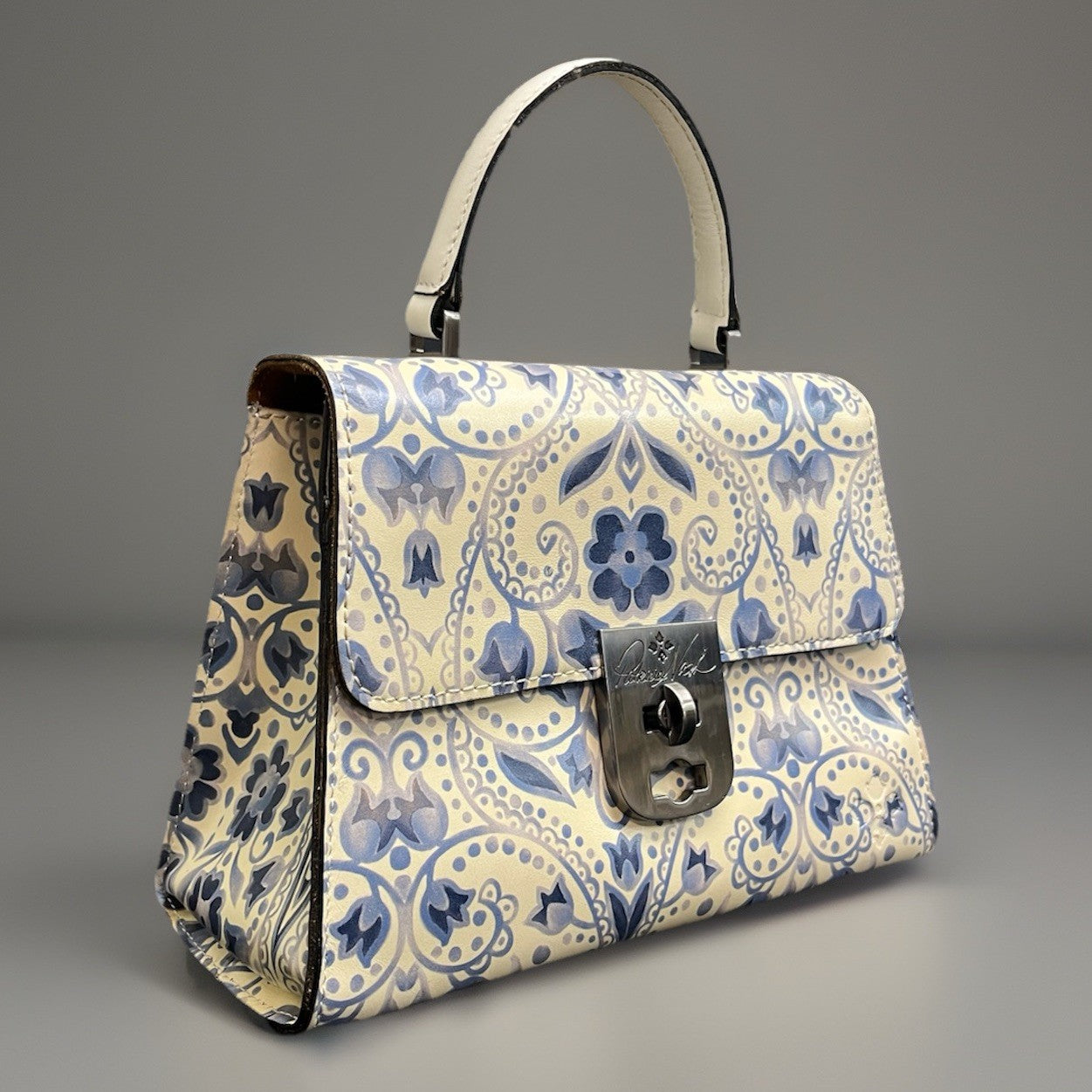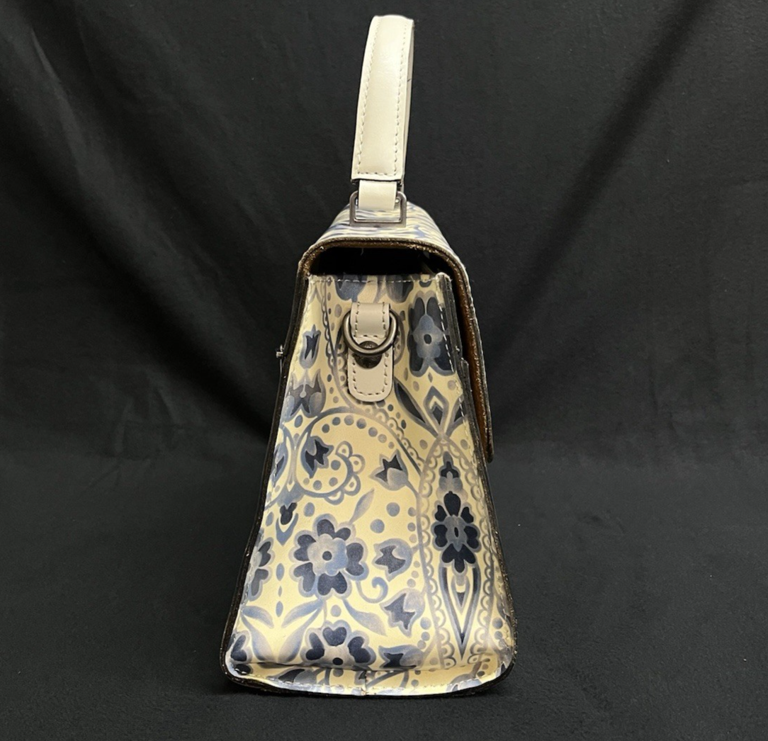 The Patricia Nash Chauny Leather Crossbody Satchel is a medium-sized rectangular bag with a double turn lock closure and a detachable blue and white cross-body strap. Made of leather with a smooth finish, the bag features a floral pattern, bottom studs, and comes with a coin purse and wristlet accessories. The Italian folklore theme and design details like the top handle, nickel hardware, and brown lining make this designer handbag a stylish and functional choice for women on the go.
