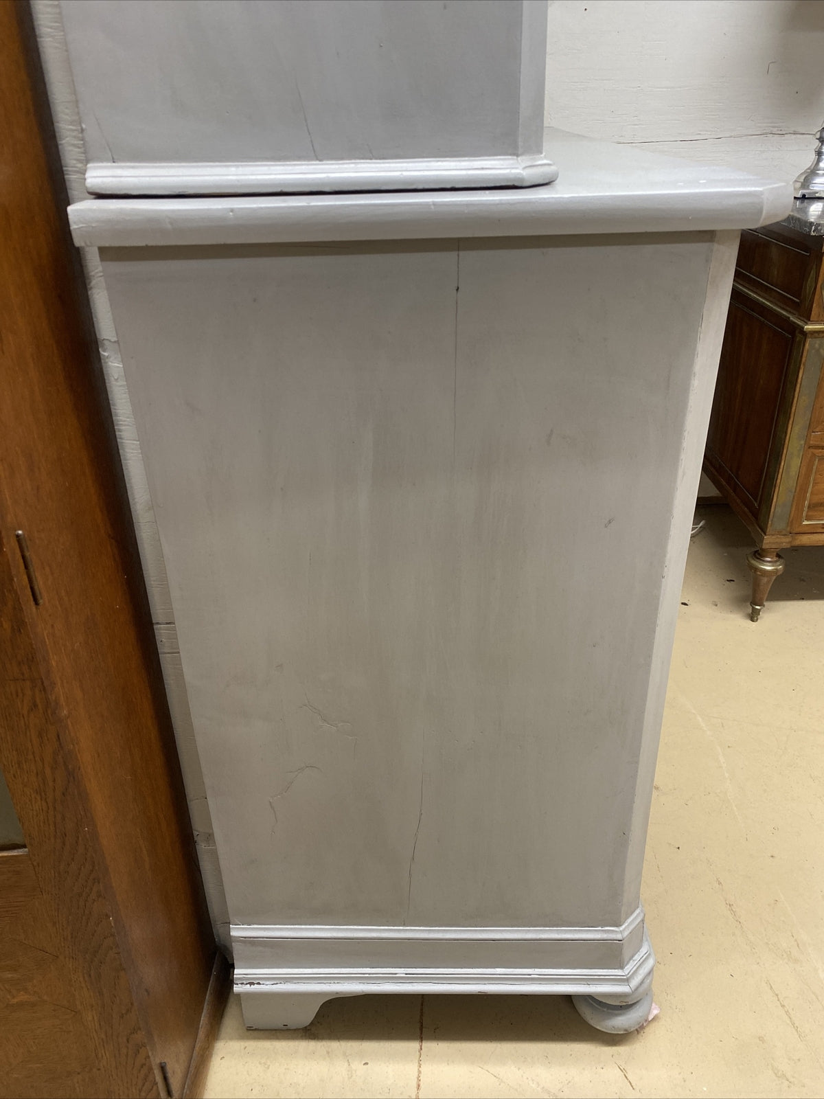 French Louis Philippe period bookcase, mid 19th c., in a later all-over, blue-tinted off-white painted finish, upper case with molded cornice over glazed double doors with two adjustable shelves, lower case fitted with two drawers with gilt metal pulls, over dual cabinet doors opening to shelved interior, rising on bun feet.