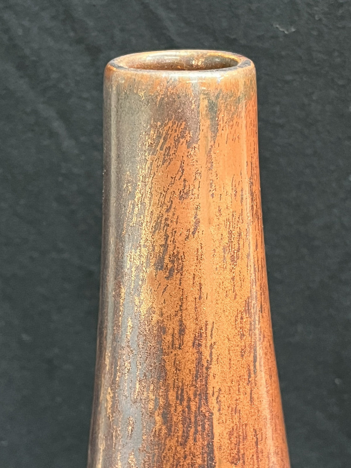 This is a handmade Art Pottery Vase, featuring a Multicolor Green and Brown Drip Glaze. It stands at 20.5 inches tall with a Mouth Diameter of 1.5 inches and a Base Diameter of 4 inches. The vase has a unique production style and technique, making it a standout piece in any decorative setting. We have a second similar vase-see the last pic.