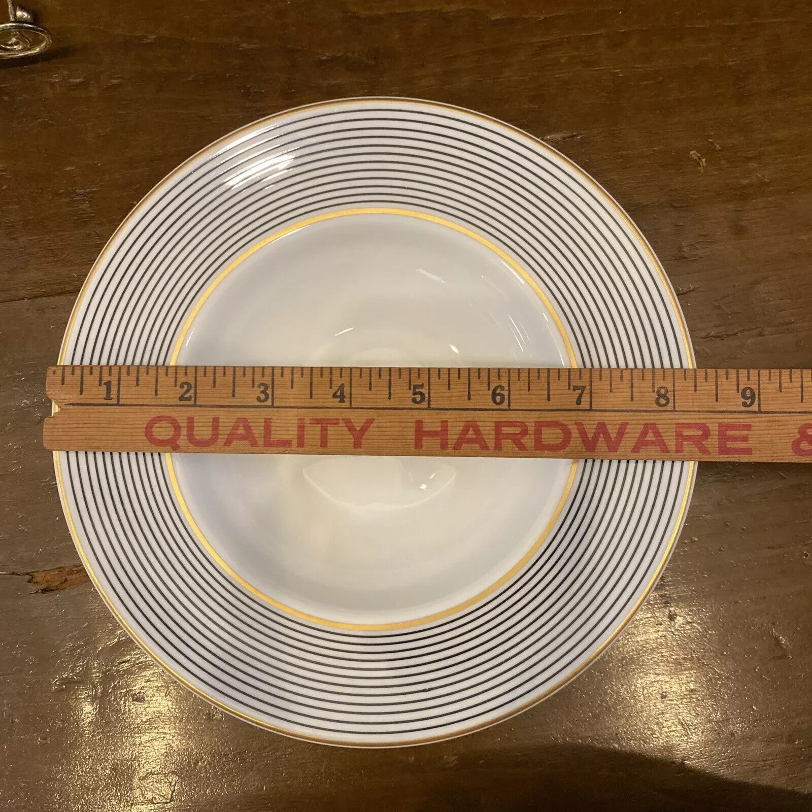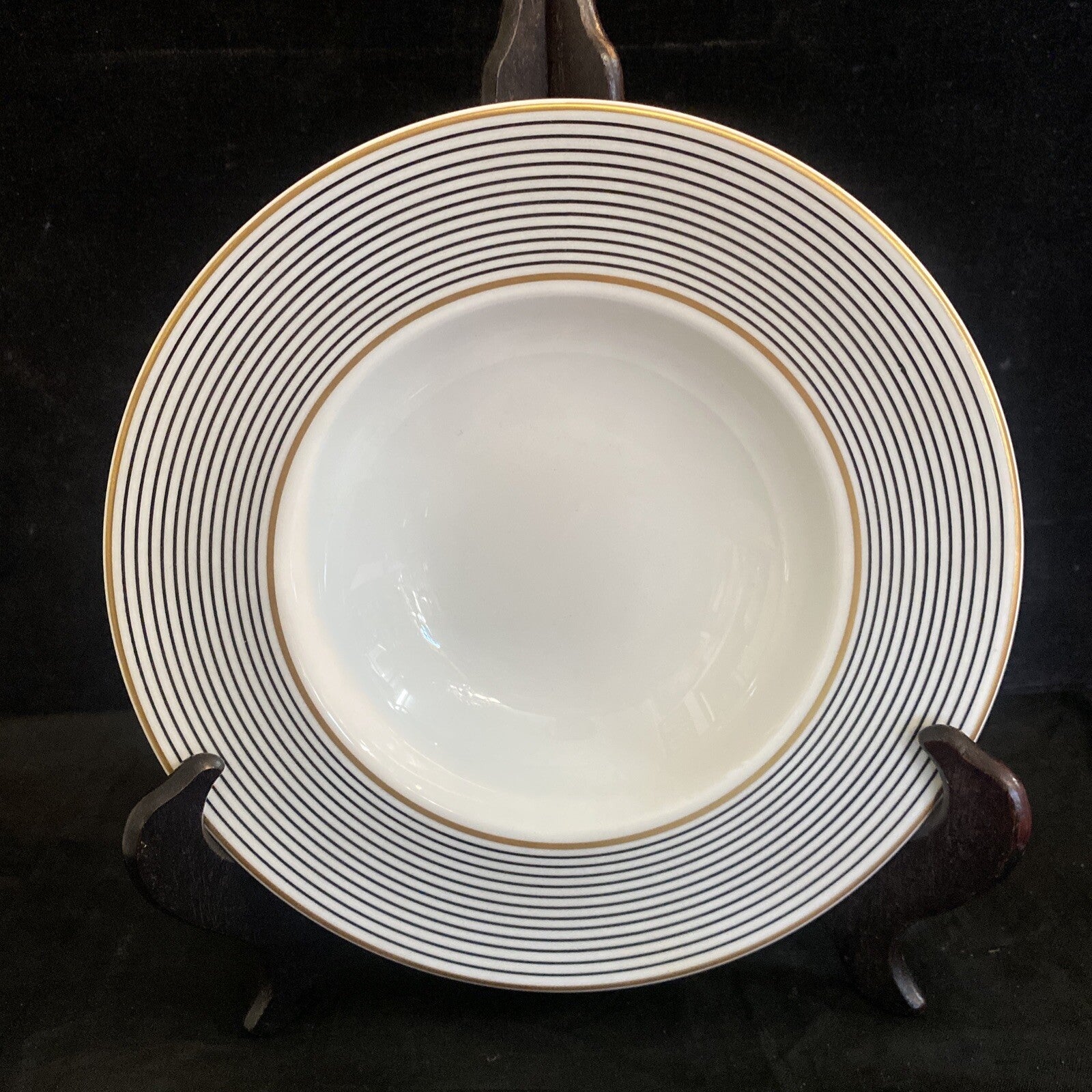 This set was produced from 1986-2000. Never used, excellent condition. It was hand painted with black concentric rings on rim and edged in gold.