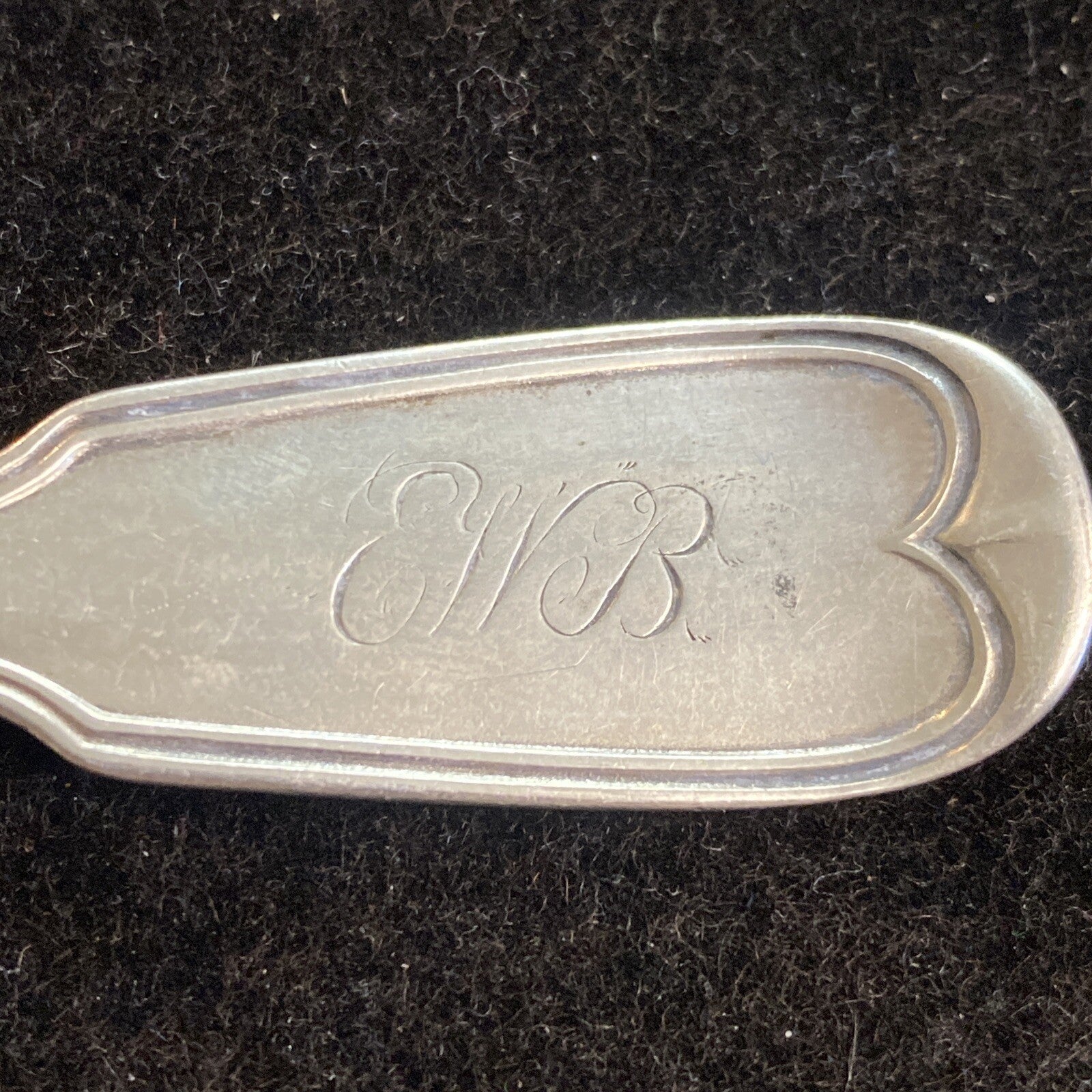 Offered for sale is this set of 3 monogrammed sterling teaspoons made by Salisbury & Co. They are 5 3/4" in length and the entire set weighs 60.44 grams. The middle spoon pictured seems to have a bit more of a rounder bowl shape than the 2 outside spoons. The 2 outside spoons have small minor dents. The spoons are monogrammed "E.W.B.".