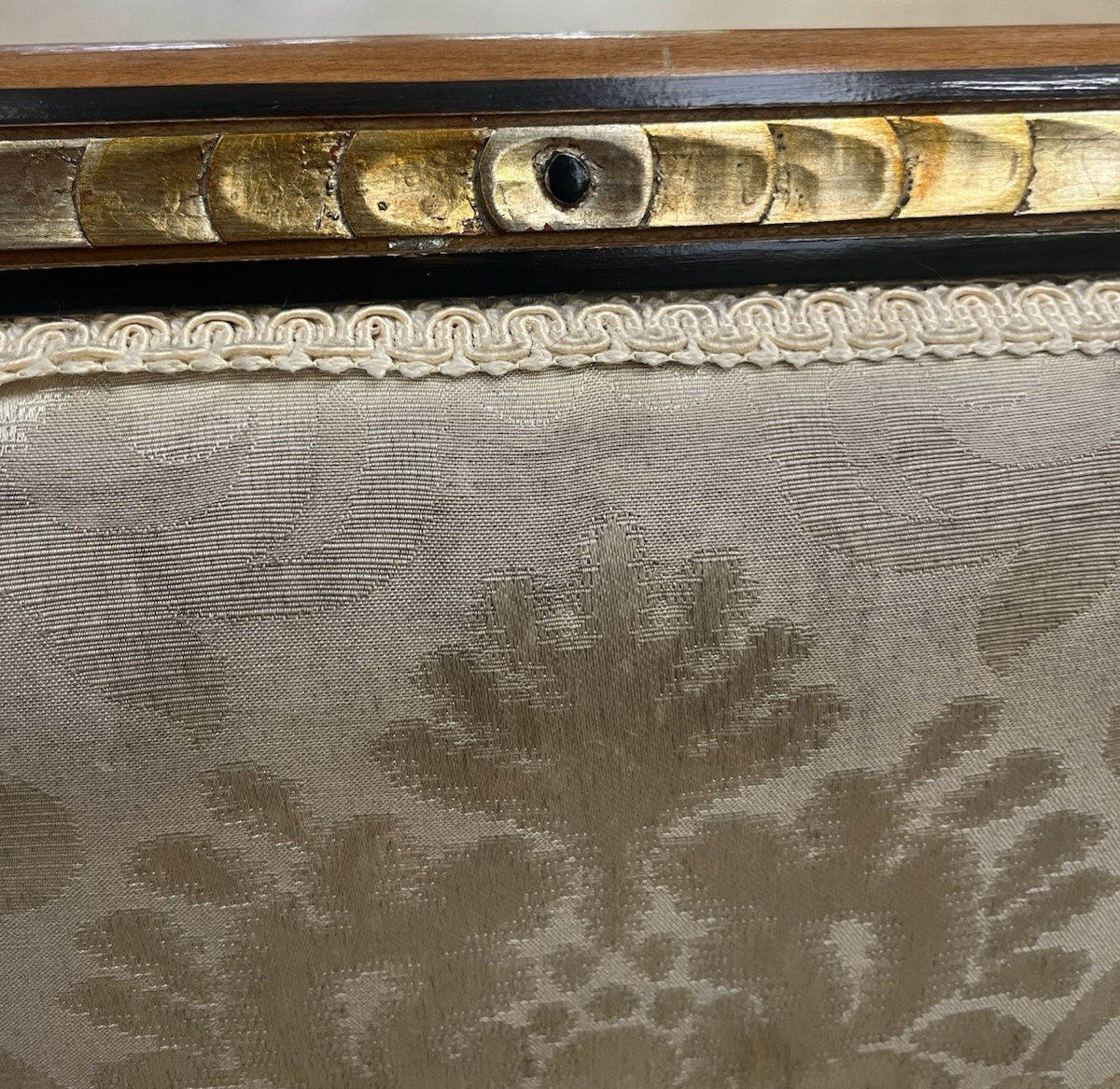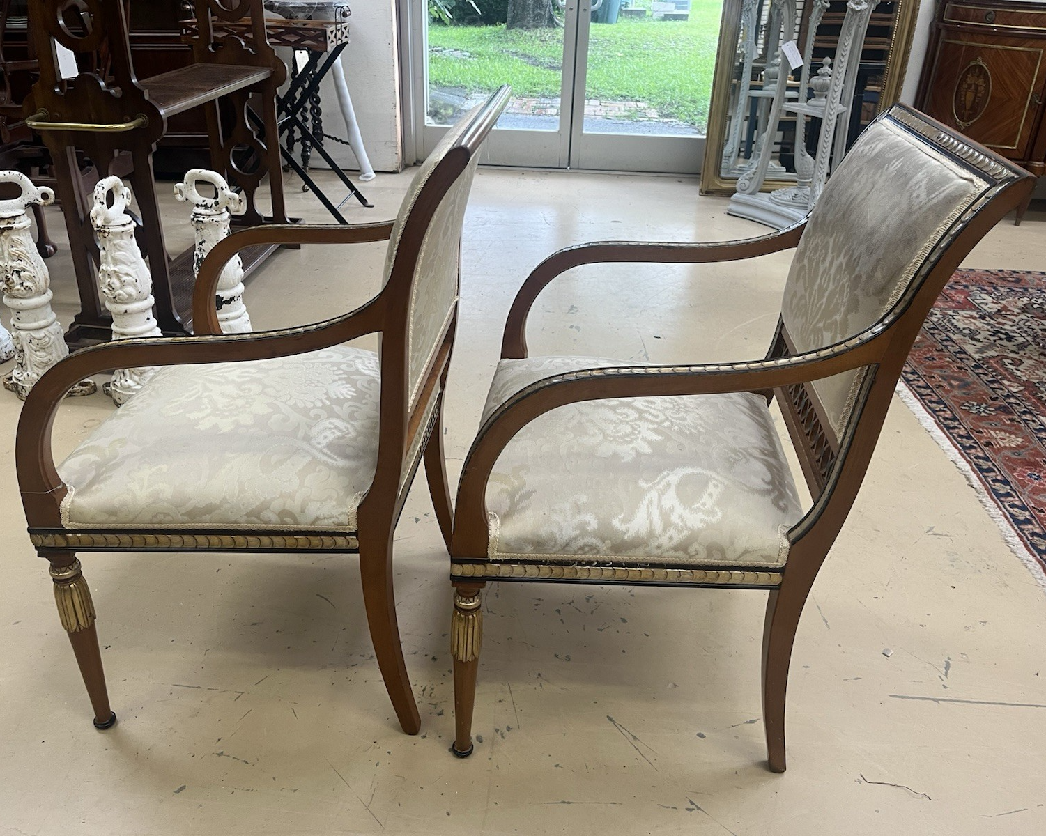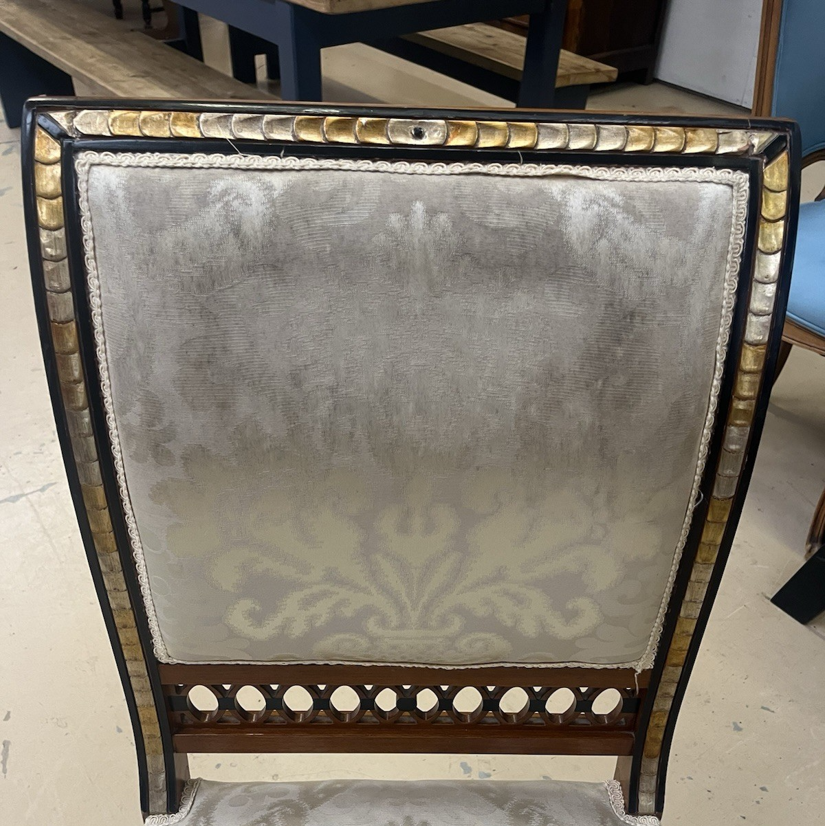 Set of 10 (2 arm and 8 side)Regency style dining room chairs attributed to EJ Victor, from the Newport Historic Collection, 20th c., dining chairs, each in patterned beige upholstery, with parcel gilt accents and ebonized trim, (two) armchairs, approx. 37.5"h, 21"w, 20"d, seat height: approx. 19"h; (eight) side chairs, 37"h, 21"w, 19"d, seat height: approx. 19.5"h, wear and crazing to varnish, upholstery with staining/discoloration Shipping costs will not be included in the price. It will be a separate invoice that will be issued 1-3 days after initial purchase.