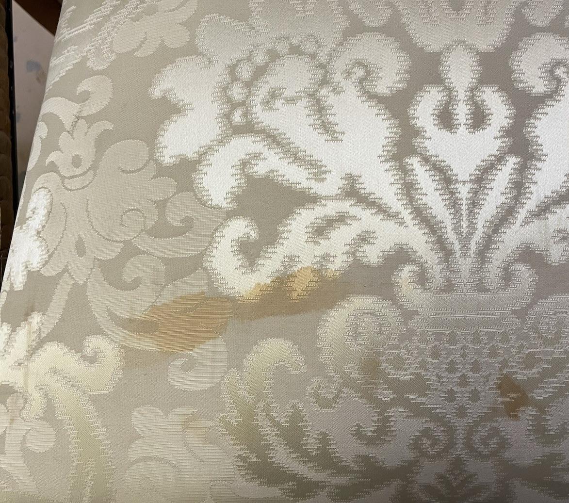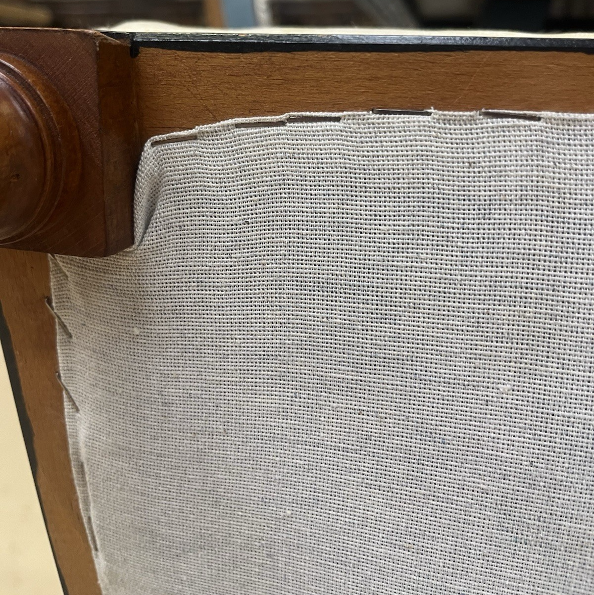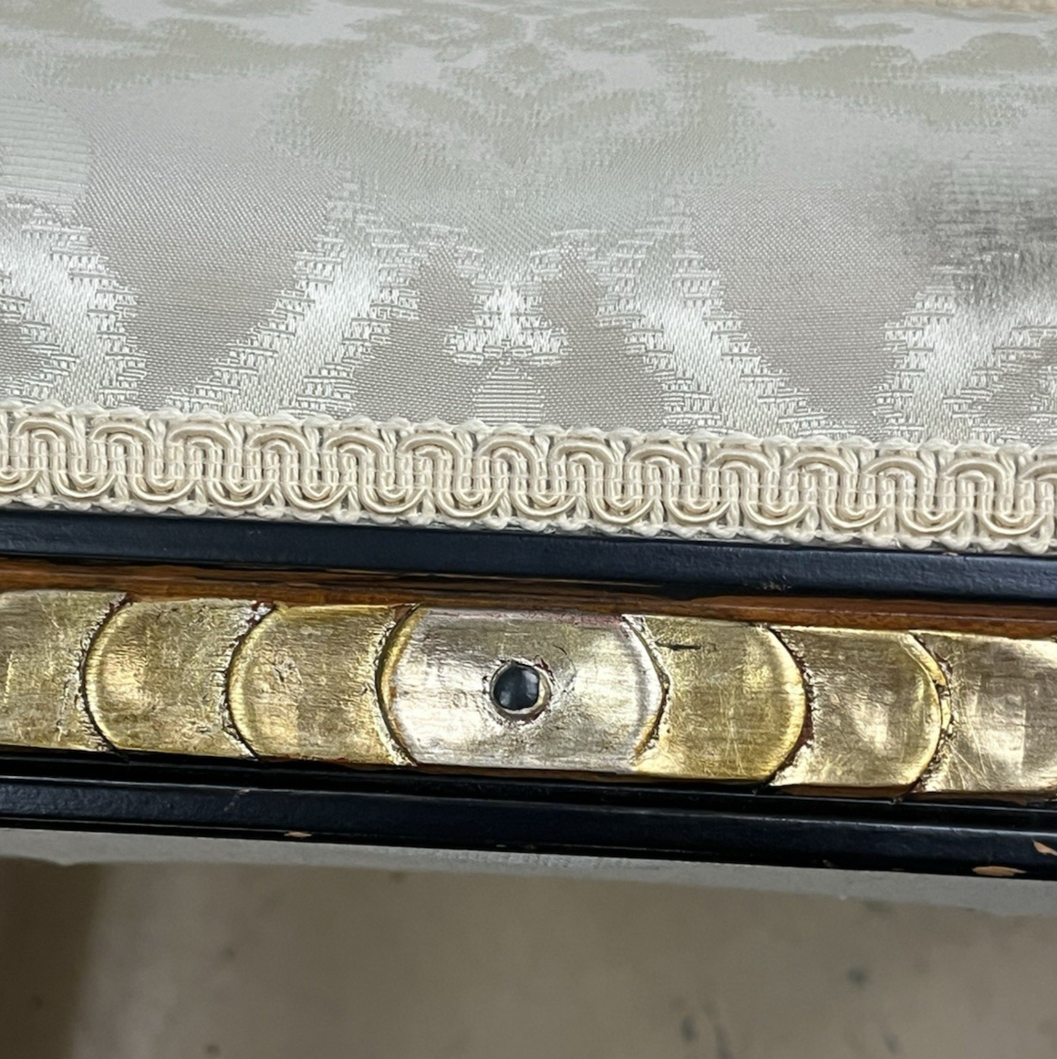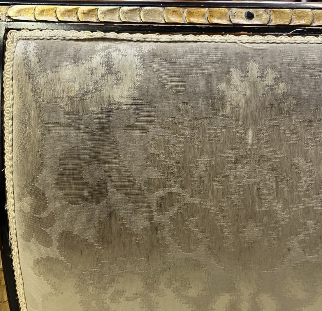 Set of 10 (2 arm and 8 side)Regency style dining room chairs attributed to EJ Victor, from the Newport Historic Collection, 20th c., dining chairs, each in patterned beige upholstery, with parcel gilt accents and ebonized trim, (two) armchairs, approx. 37.5"h, 21"w, 20"d, seat height: approx. 19"h; (eight) side chairs, 37"h, 21"w, 19"d, seat height: approx. 19.5"h, wear and crazing to varnish, upholstery with staining/discoloration Shipping costs will not be included in the price. It will be a separate invoice that will be issued 1-3 days after initial purchase.
