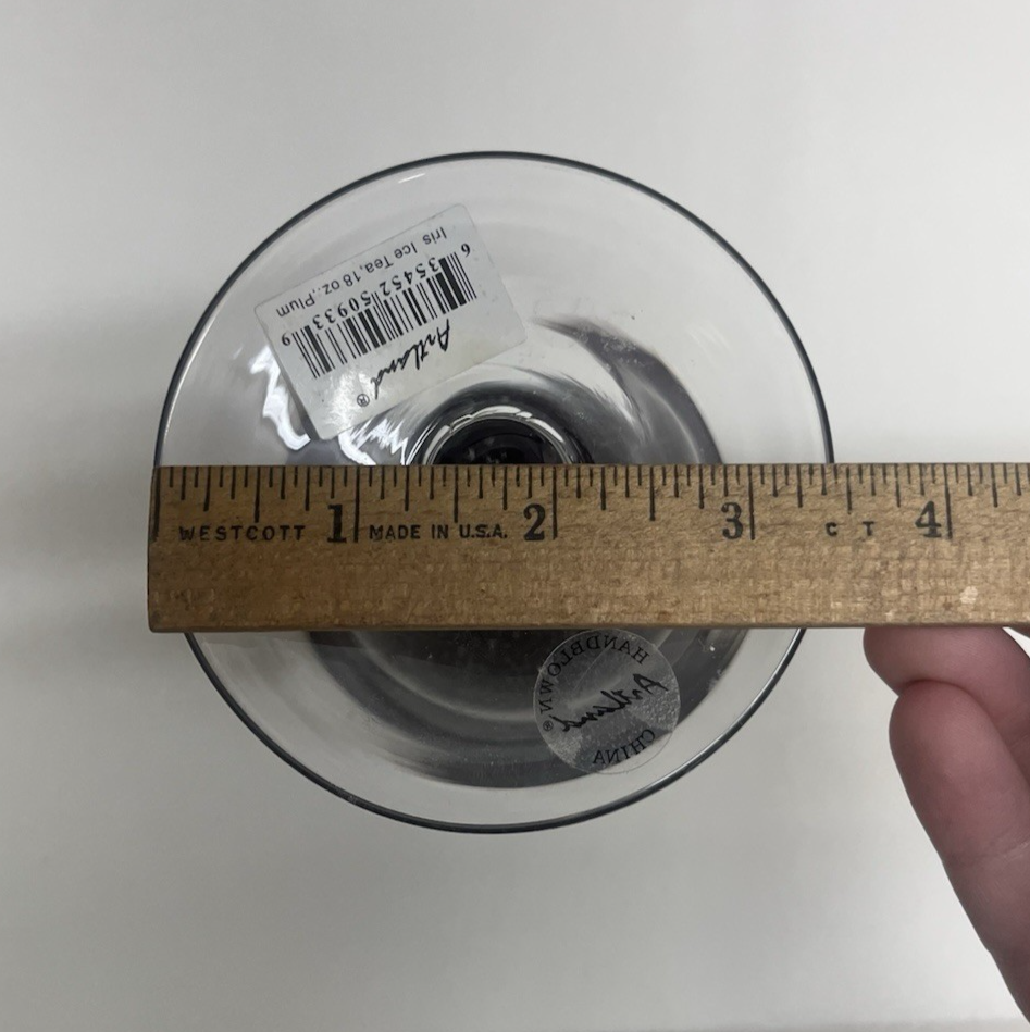 This set of 3 Artland Blown Glass Iris Plum Footed Ice Tea Glasses with Tags stands at 7.5 inches tall and has a capacity of 18 fluid ounces. This glass retails for $30 each at Replacements.
