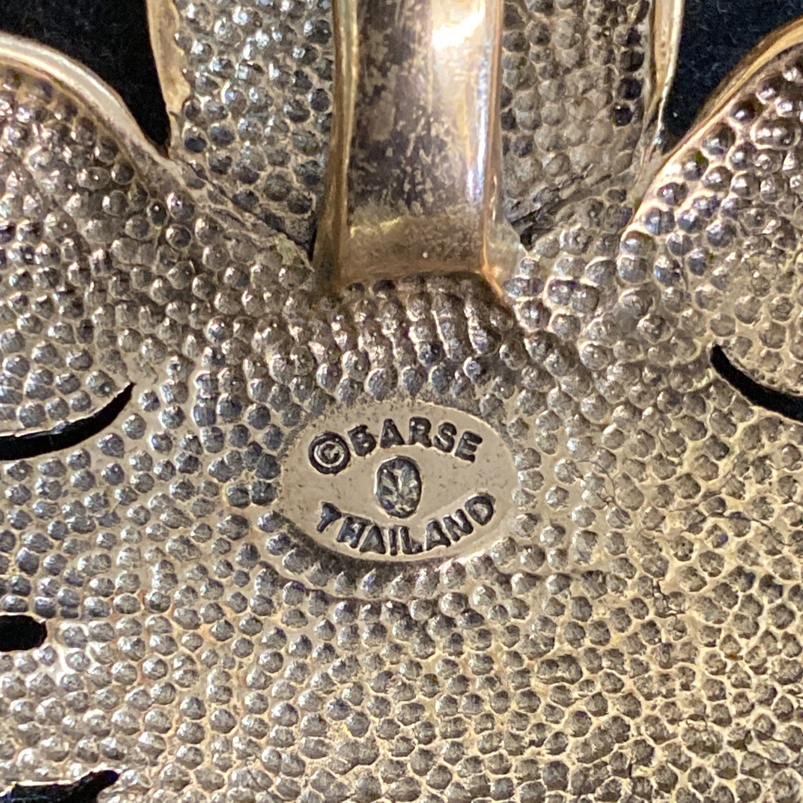 This is a heart-shaped pendant made by Barse in Thailand. It is made of bronze and features floral filigree. The pendant is signed by the maker and measures 2 3/4 inches. The color of the pendant is brown with no main stone.