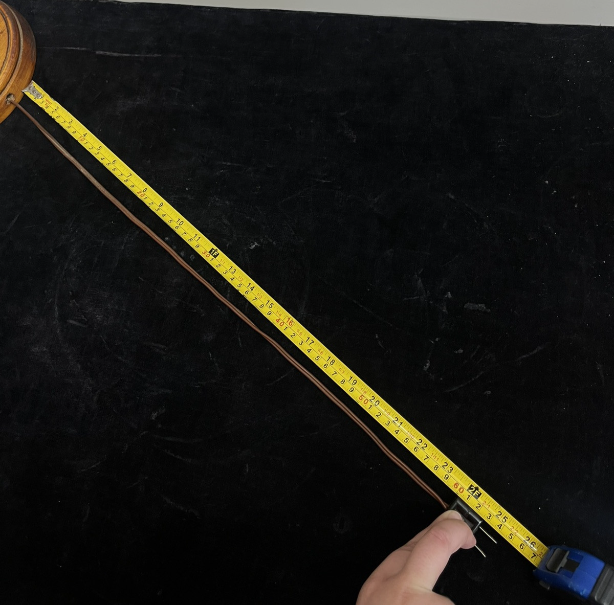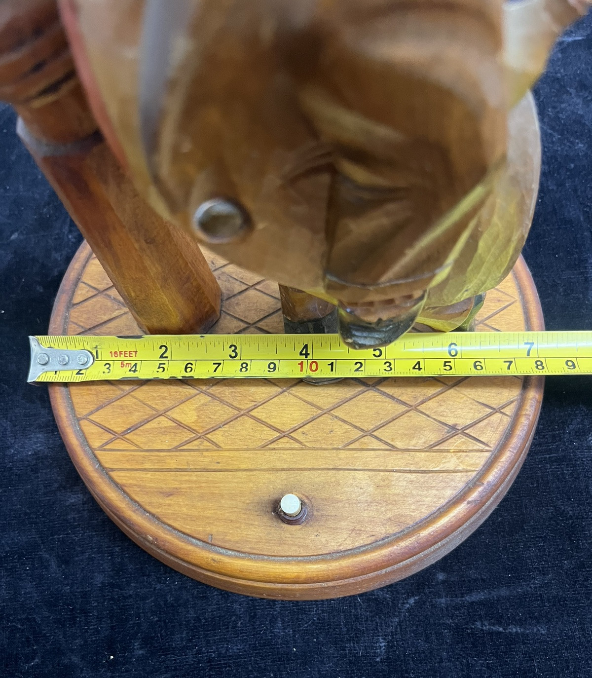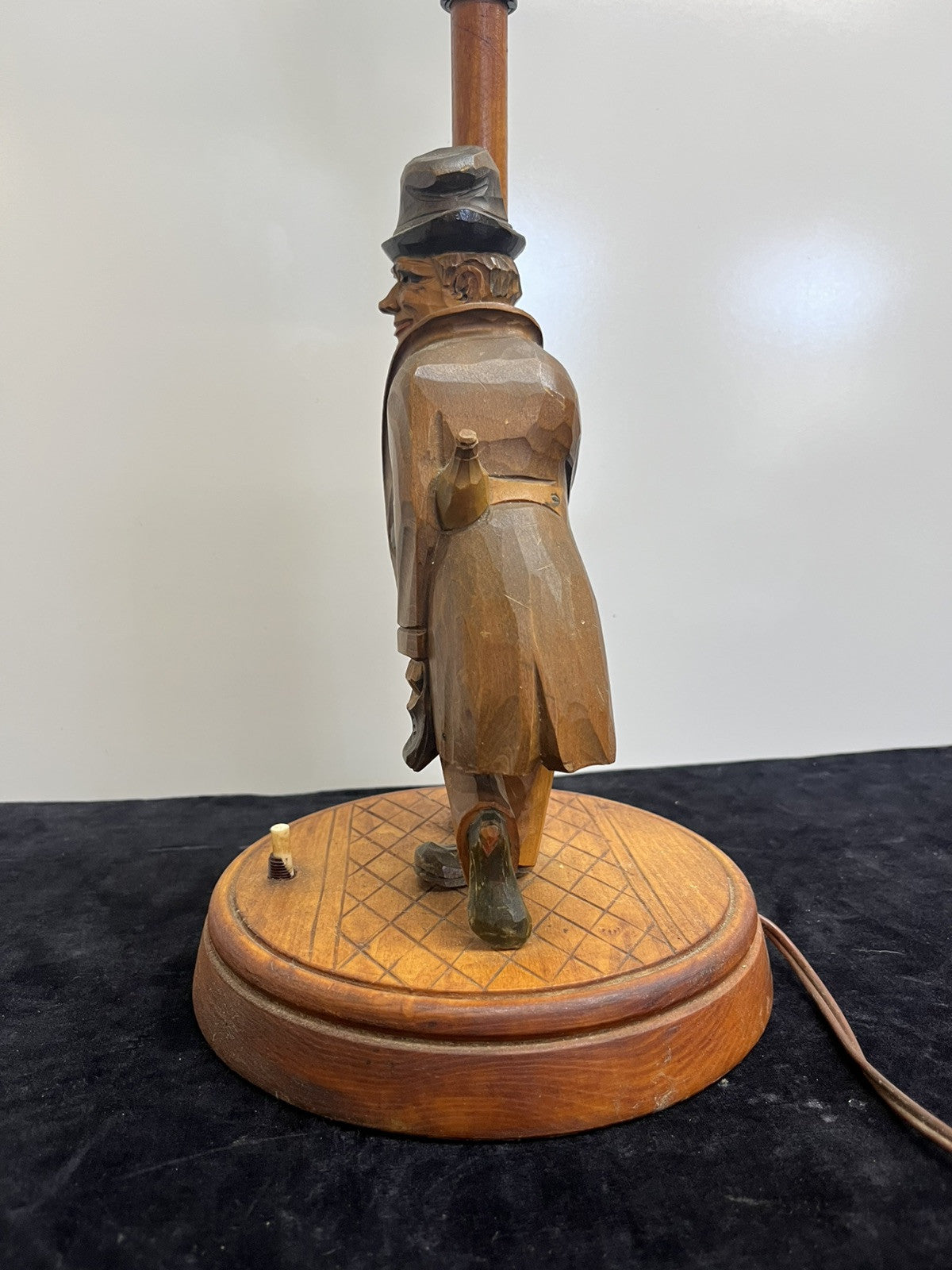 This is a vintage, corded electric table lamp made of solid wood and metal. It features a unique Black Forest design with a hand-carved drunk figure. The lamp has a push button control style and a light sensor for convenience. The lamp includes a bulb and has a multicolor finish. With a height of 19 inches, this German-made piece by Karl Griesbaum adds a touch of whimsy and charm to any space.