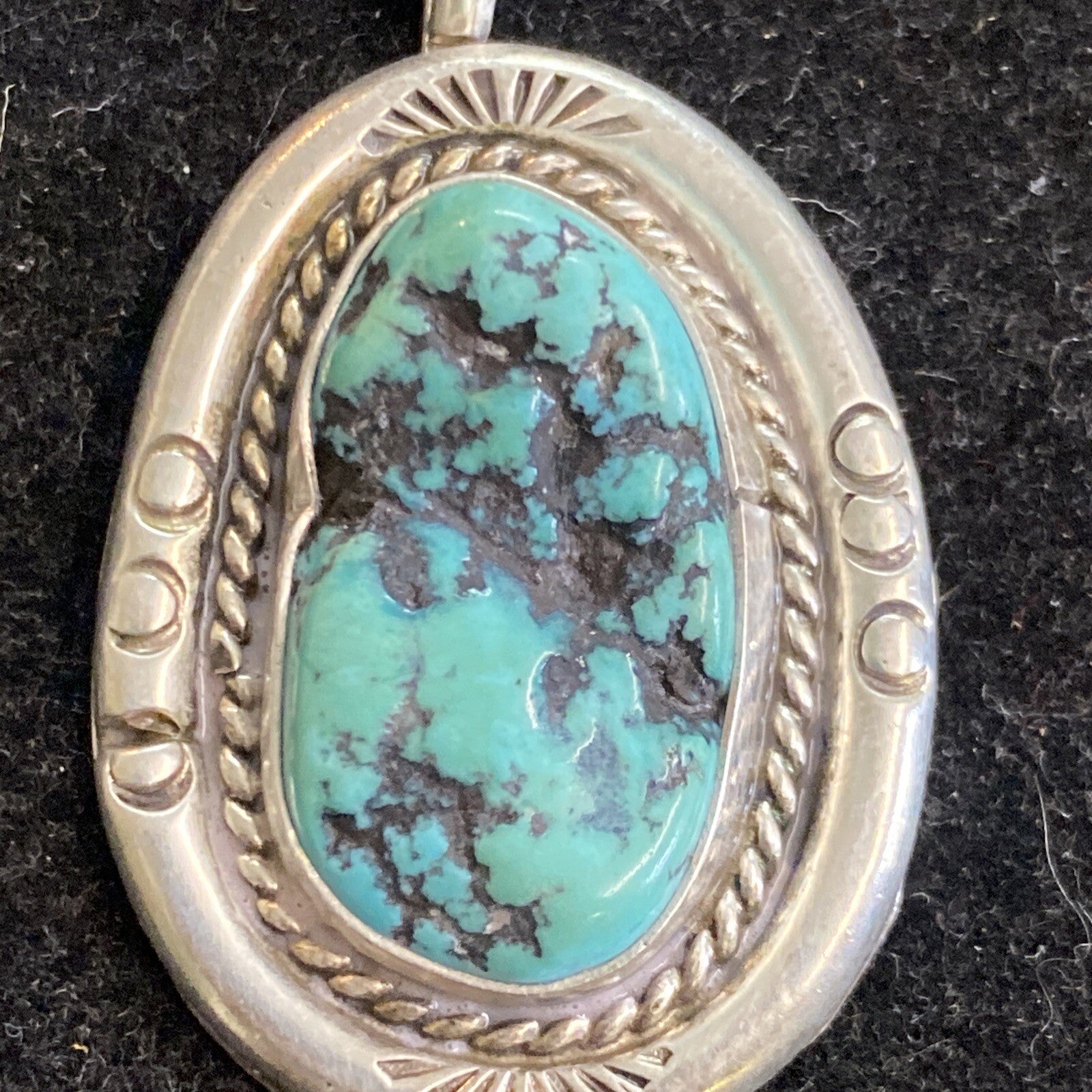 Add a pop of color to your jewelry collection with this sterling silver pendant featuring a beautiful turquoise stone. The intricate design of this pendant showcases the impeccable craftsmanship of the jeweler. The pendant is versatile enough to be worn with casual or formal wear, making it a great addition to any outfit. Perfect for those who love unique and eye-catching pieces, this pendant is sure to be a conversation starter.