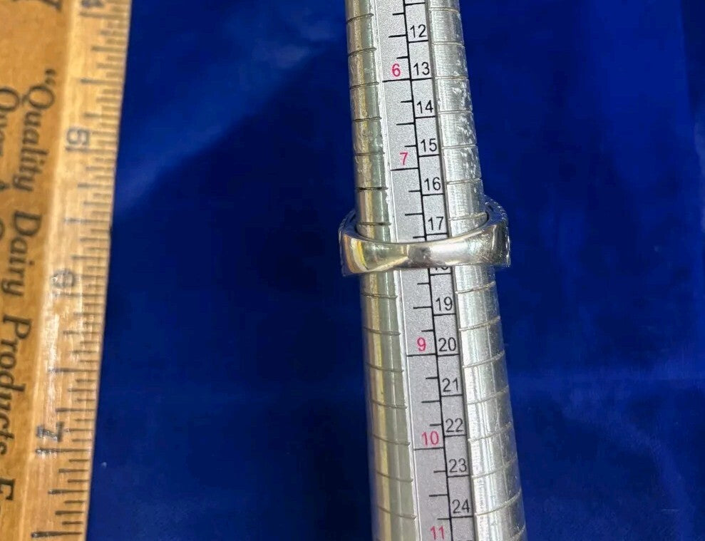 Add a touch of elegance to your jewelry collection with this beautiful sterling silver ring. The ring features a stunning black onyx center stone with flanking clear marquis stones set in a geometric pattern. Crafted from high-quality 925 sterling silver, this ring is perfect for any occasion. The ring size is 8 and the weight is 8.2 grams. This ring is a great addition to any fine jewelry collection. Marked ES 925 THAI.