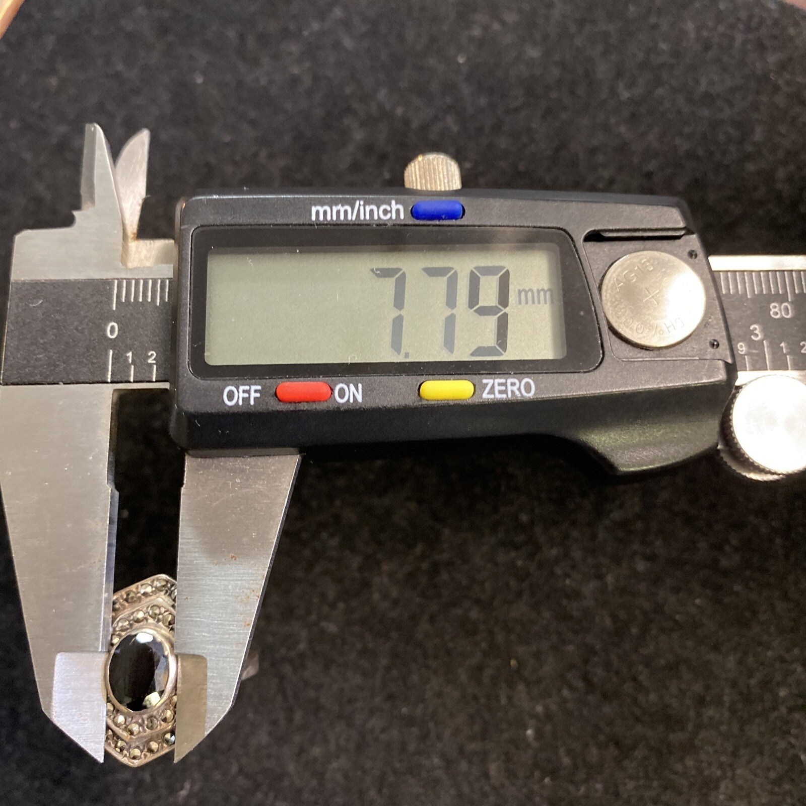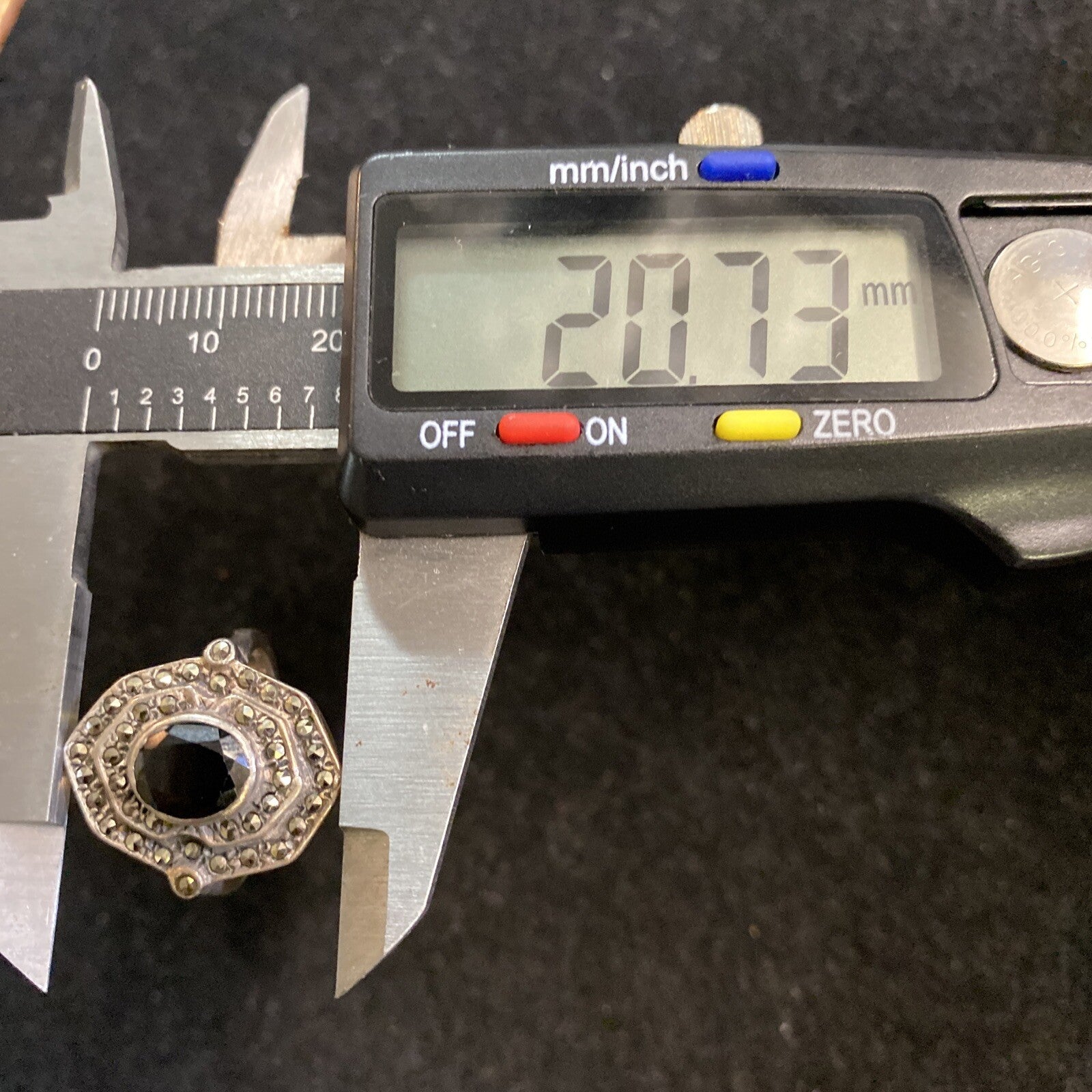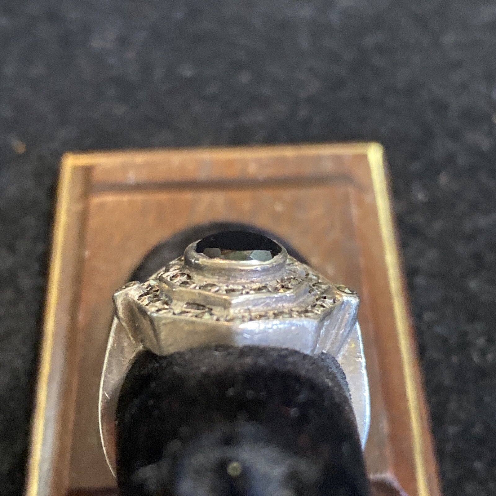 . The black onyx stone is the centerpiece of the ring, and the marcasite accents add a touch of sparkle and shine.