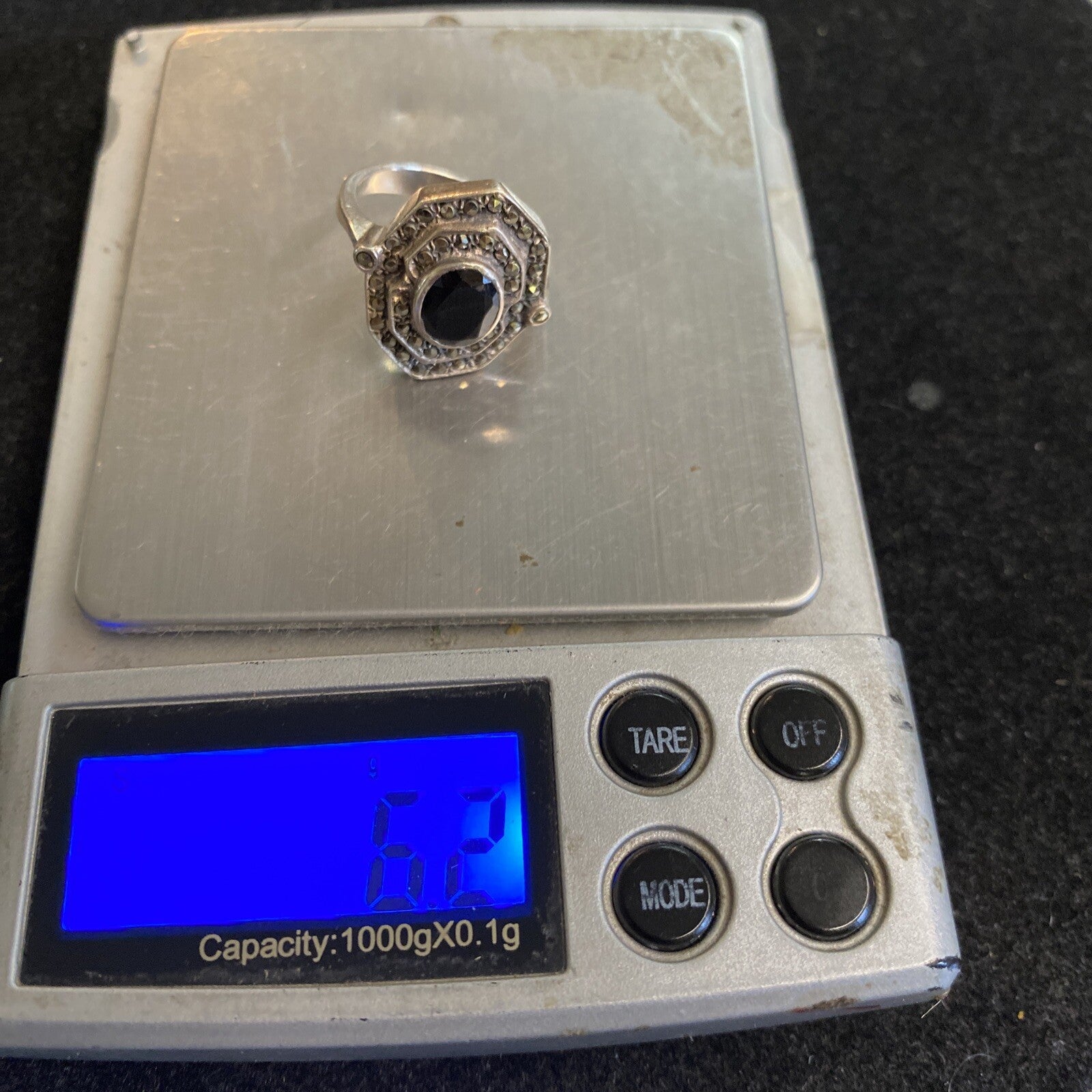 This stunning ring features a faceted black onyx stone and marcasite accents, set in sterling silver marked 925. The design is both elegant and unique,