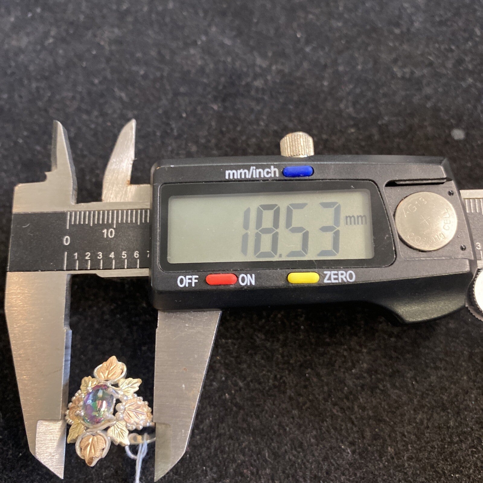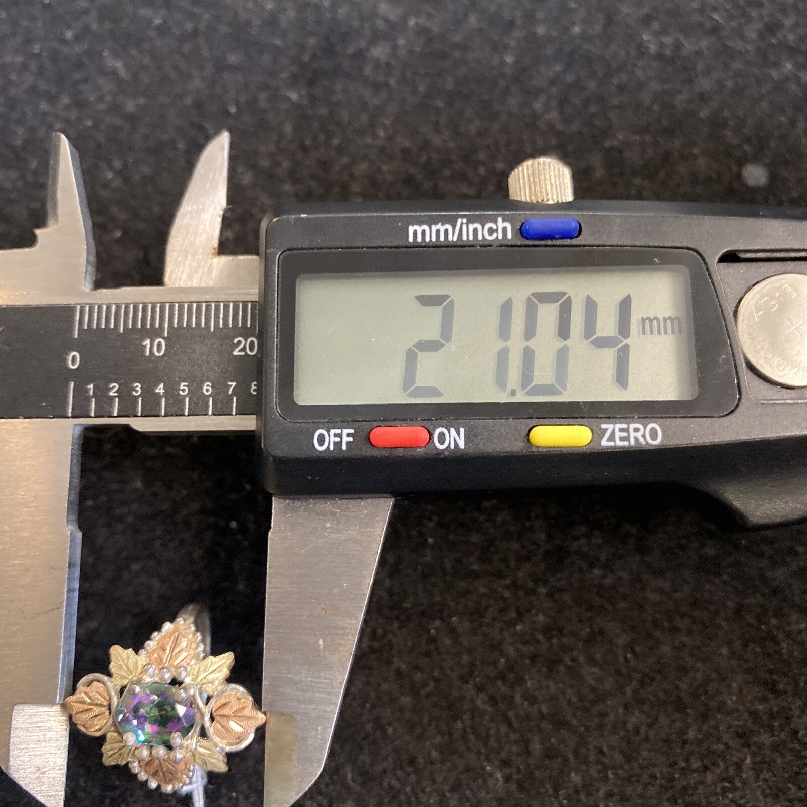 This stunning ring features a beautiful leaf design crafted from sterling silver and rose gold. The mystic topaz stone adds a touch of elegance to this piece, making it the perfect addition to any jewelry collection. The ring is available in size 6.75 and is ideal for any occasion. can be sized.