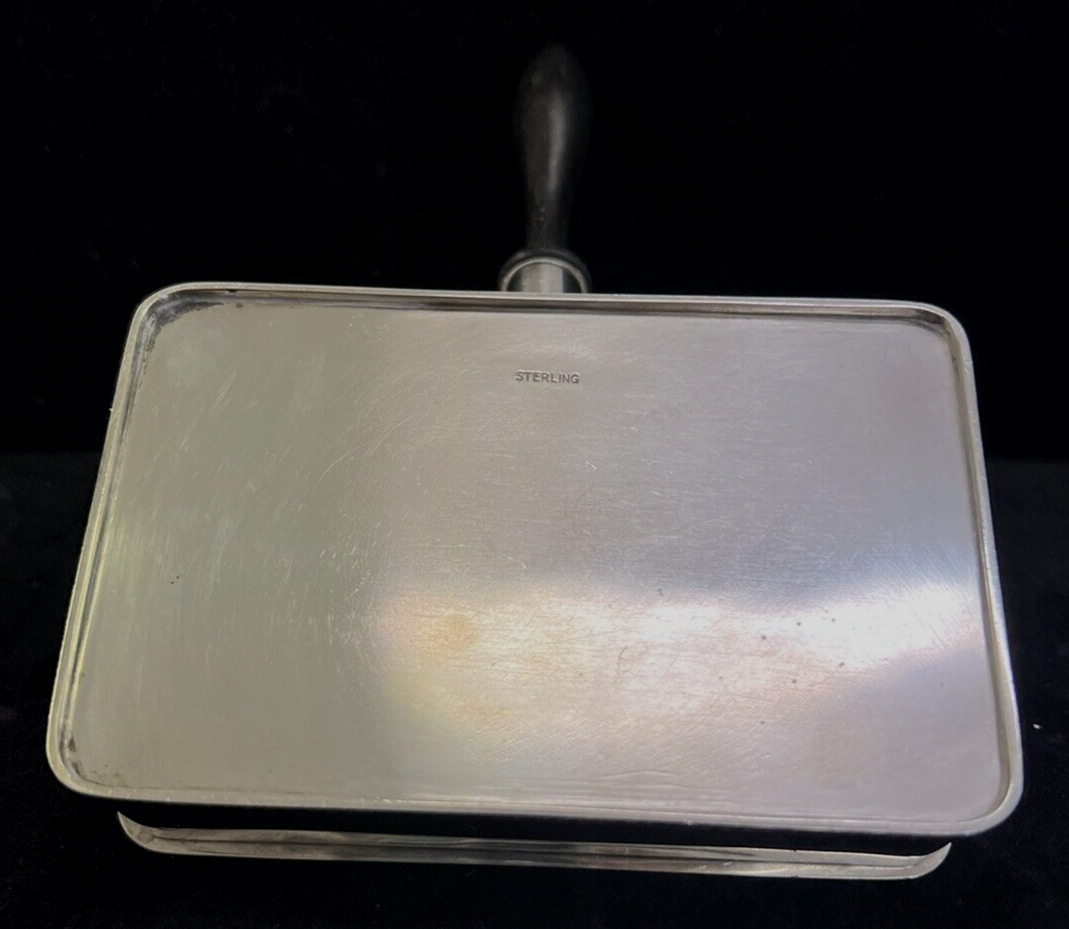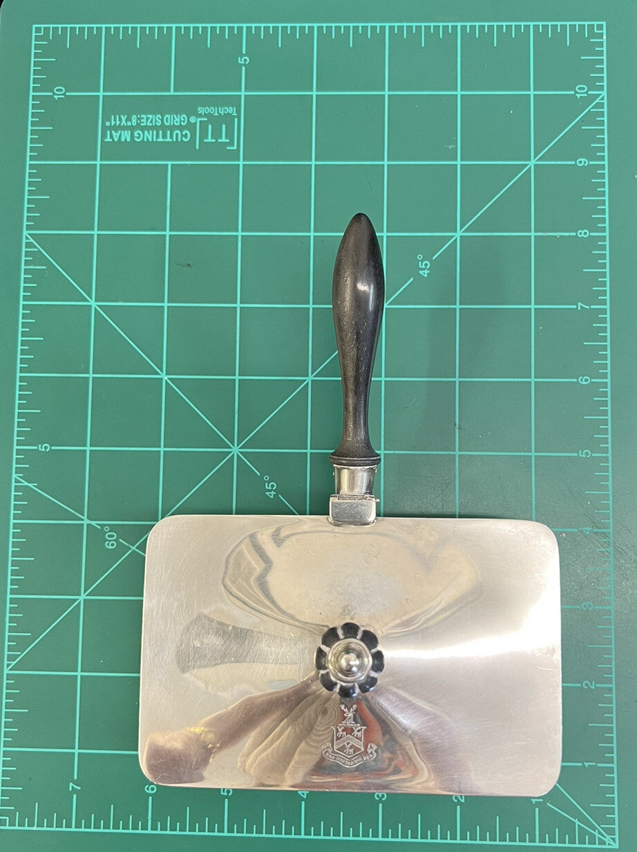 Engraved on the lid of this antique English solid sterling bread cumber is the Rogers Coat of Arms and motto " Nos Nostraque Deo"a Latin sentence translated " we and ours to God". The bread crumber has an ebony handle and finial . Marked sterling, weighs 290 grams.