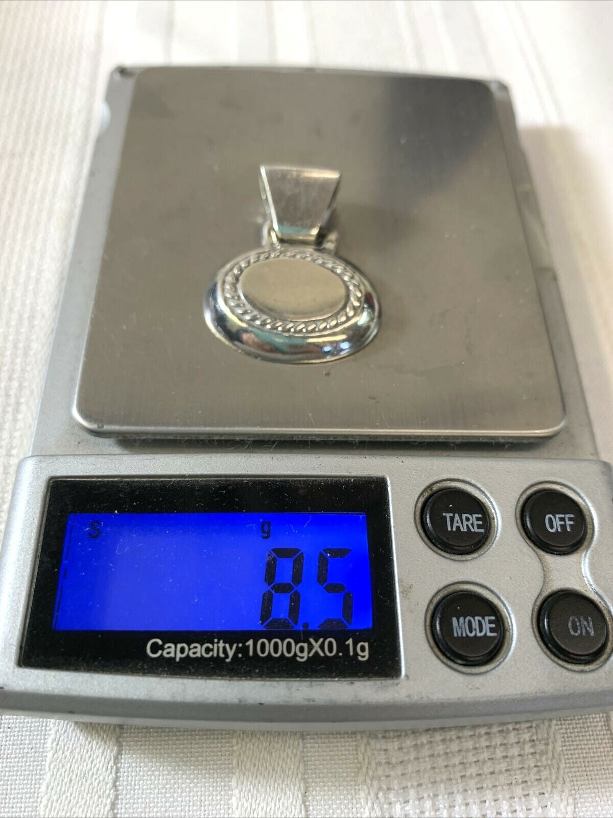 Offered for sale is a small sterling oval pendant with rope engravings and a bail that weighs 8.5 g, measures 1" long and 1 " wide. Good condition.
