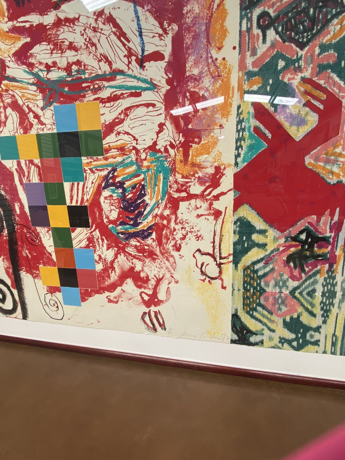 Terrence La Noue (American), "Dreams of Gods" Ritual Series, 1987, mixed media lithograph, signed and dated lower right corner. Approx. h. 52", w. 57" (frame), h. 44", w. 49" (paper).