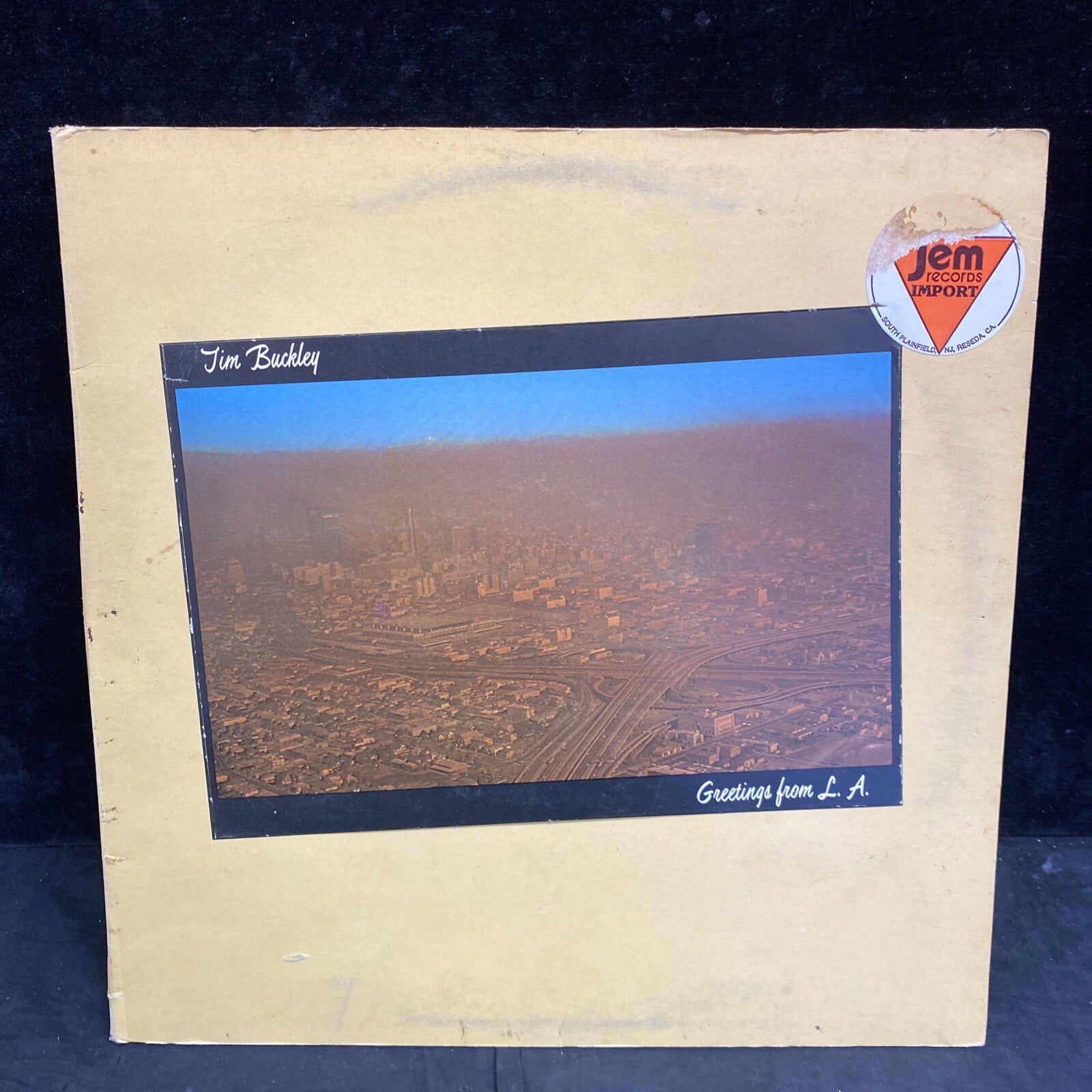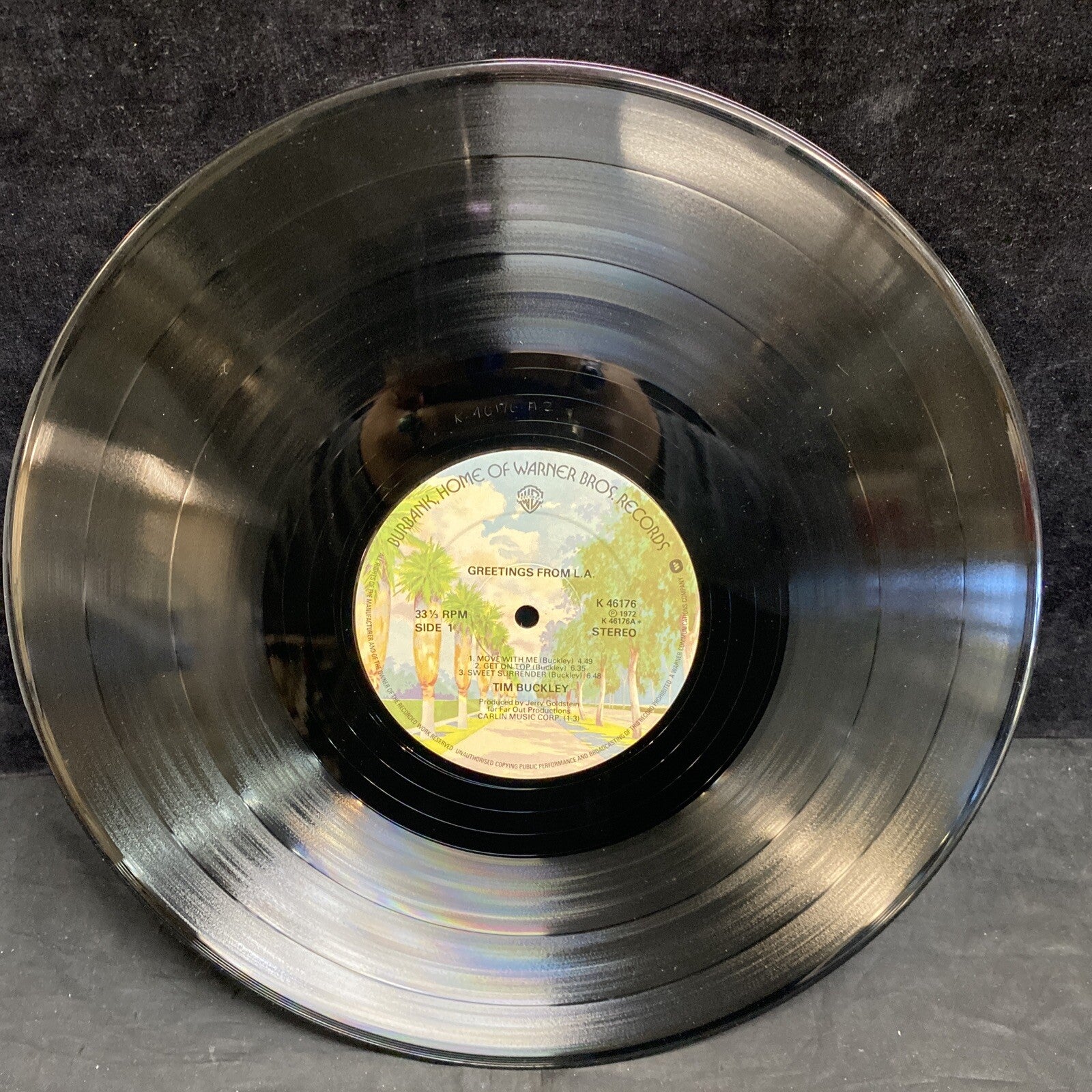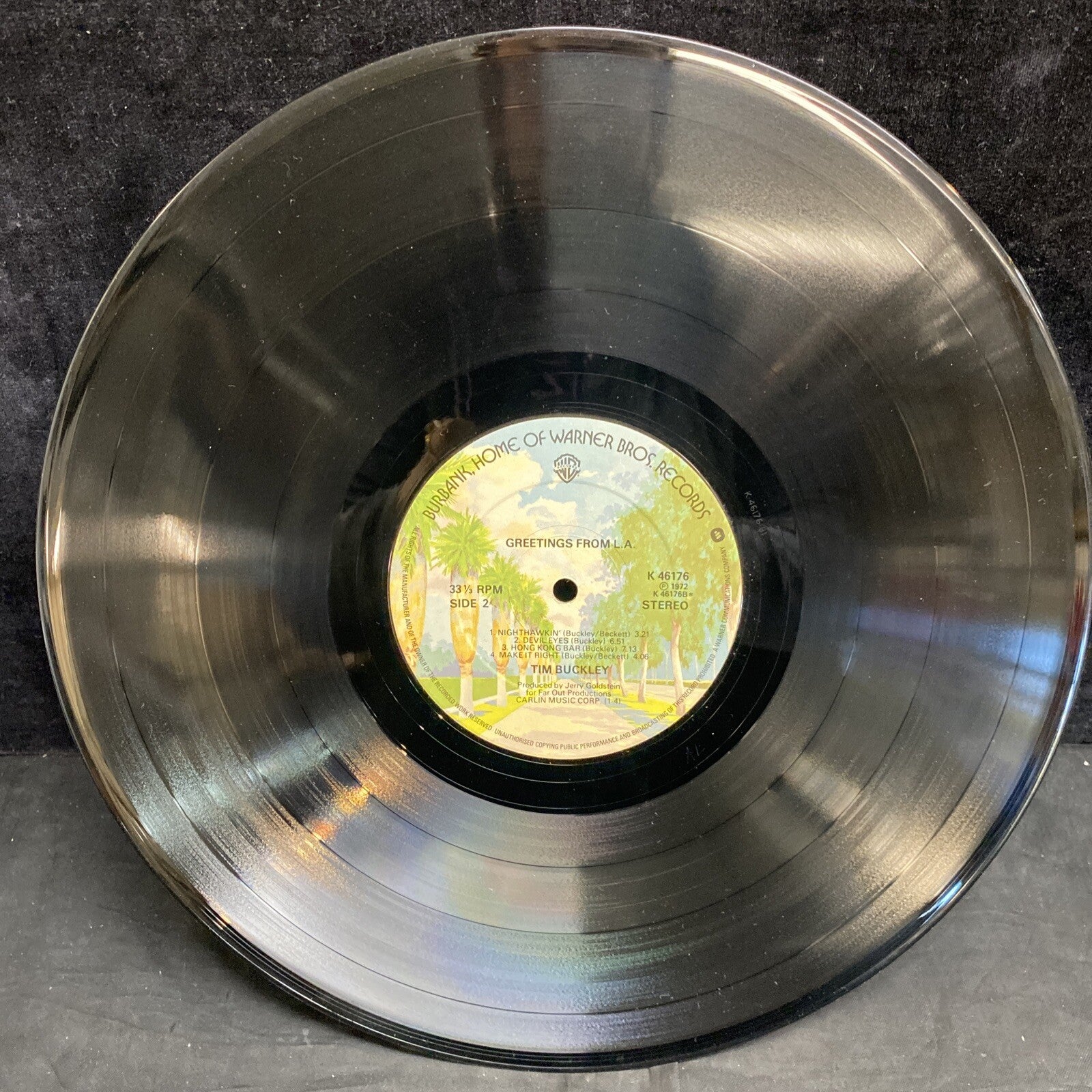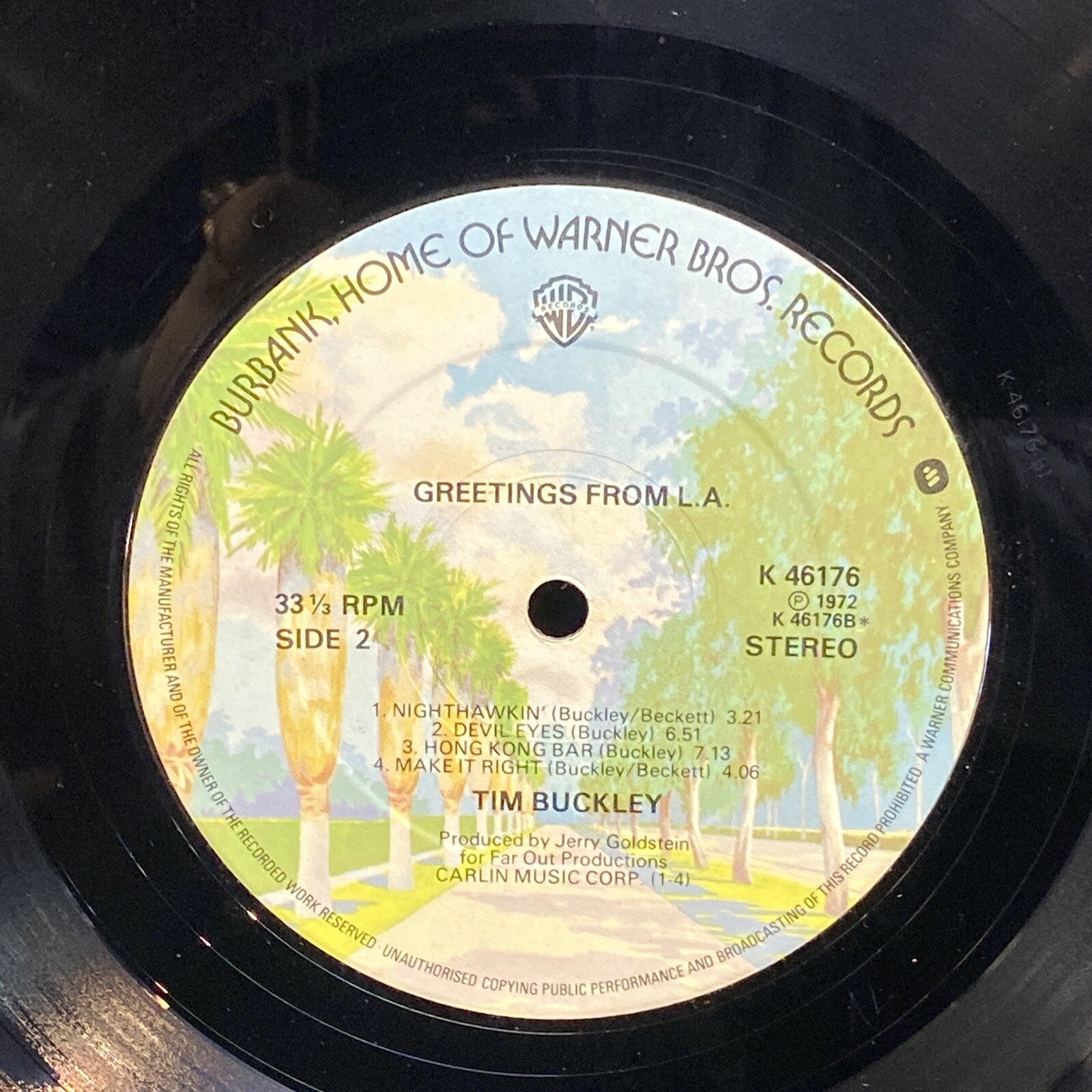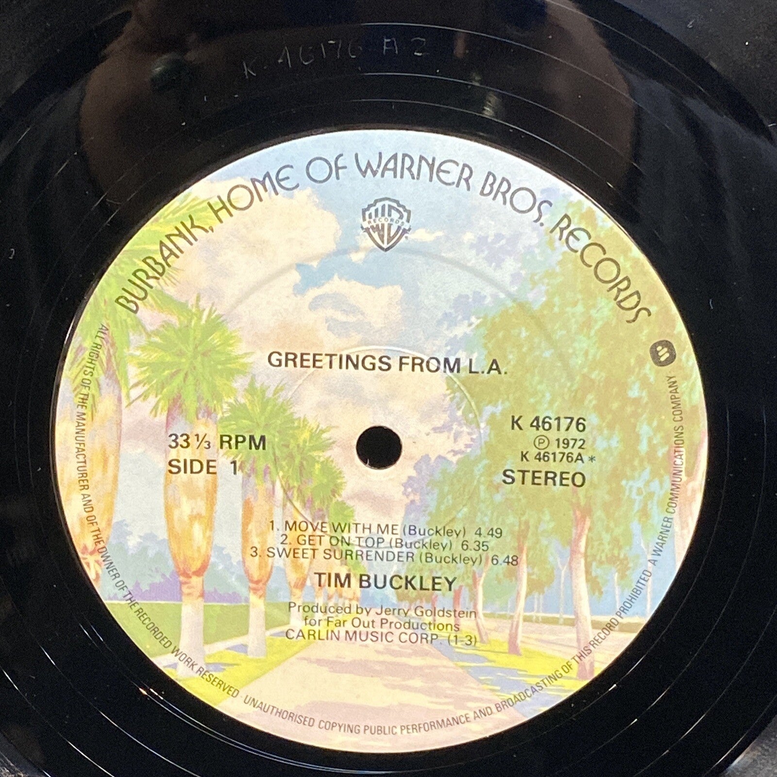 This is a 12" vinyl LP with a die-cut postcard titled "Greetings From L.A." by Tim Buckley. The record label is Warner Bros