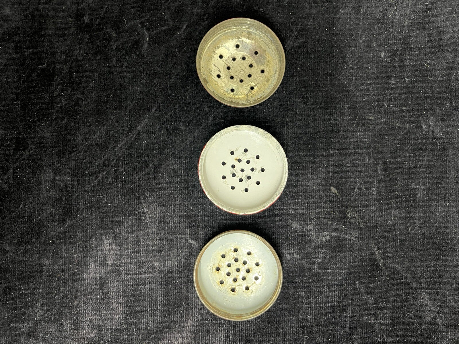The Tipp City Milk Glass Red and Yellow Poppies Shakers Set of 3 features a floral pattern with red and yellow poppies. Each shaker measures 4.25 inches in height and 2 inches in length and width. Perfect for adding a touch of vintage charm to your kitchen or collection.