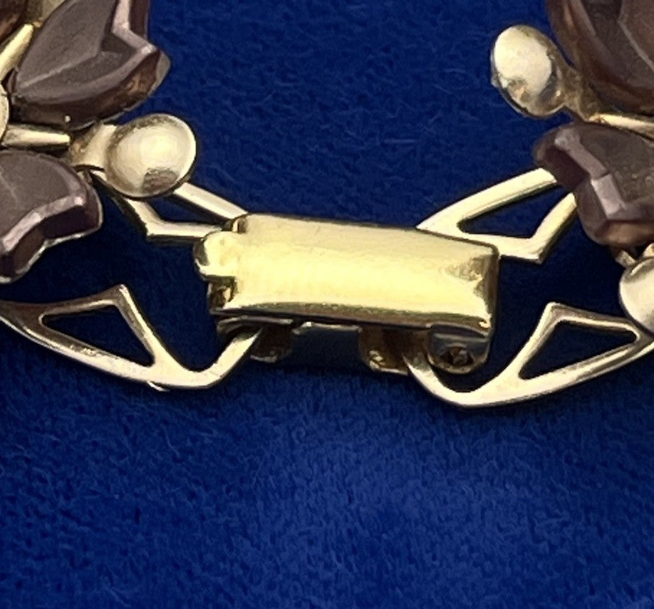 Offered for sale is a 1940's era two tone metal flower 10 link bracelet with a clear rhinestone center. The bracelet is unsigned, looks like Kreisler. Excellent condition. Measures 7.5" long x 3/4" wide, box closure. Pictures don't do this delicate beauty justice.