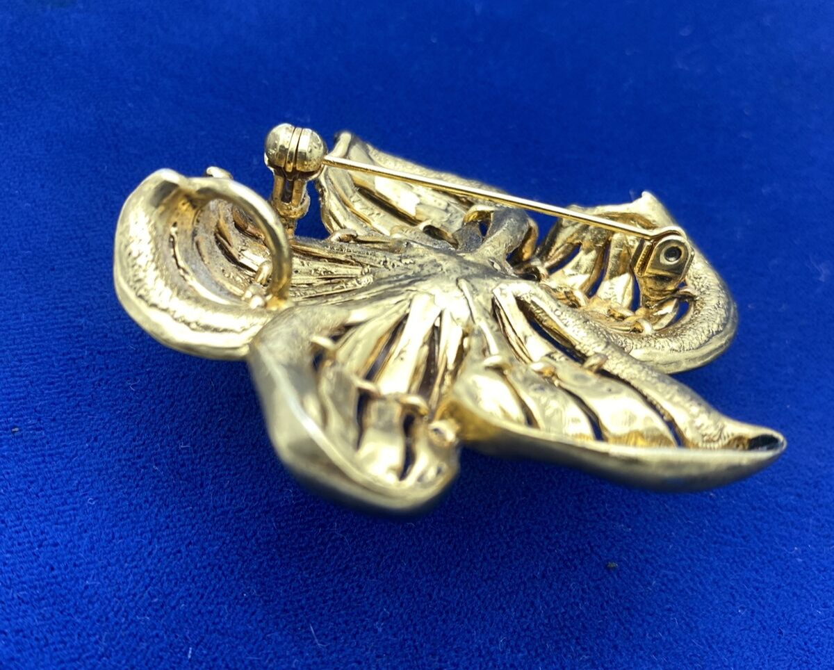 Offered for sale is a dogwood goldtone and amber rhinestoned pin, vintage 1970's. The center is a large gold simulated pearl. It measures approx 2 1/4" wide. Excellent condition.