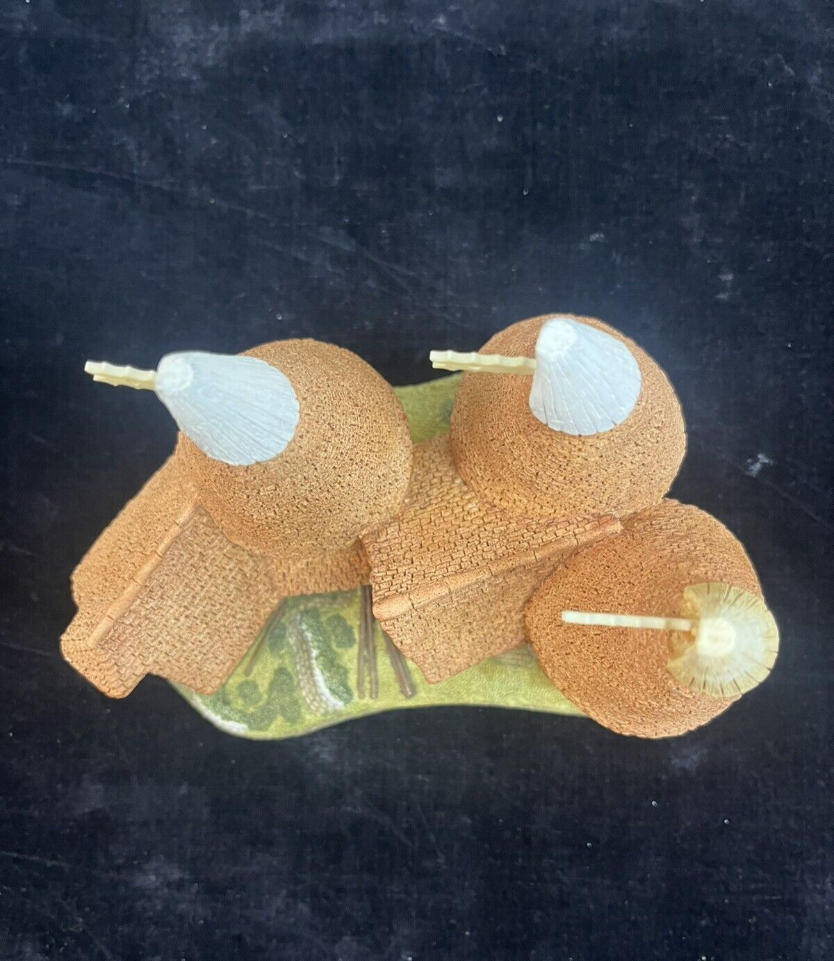 This vintage 1981 David Winter TRIPLE OAST is a hand-painted ceramic miniature depicting a rustic village scene. The asymmetrical shape features three oast houses in a beige color with a rural pattern. Measuring 7.5 inches in length, 6 inches in height, and 4.5 inches in width, it is suitable for any room and part of the David Winter collection. The piece is engraved and comes in its original box.