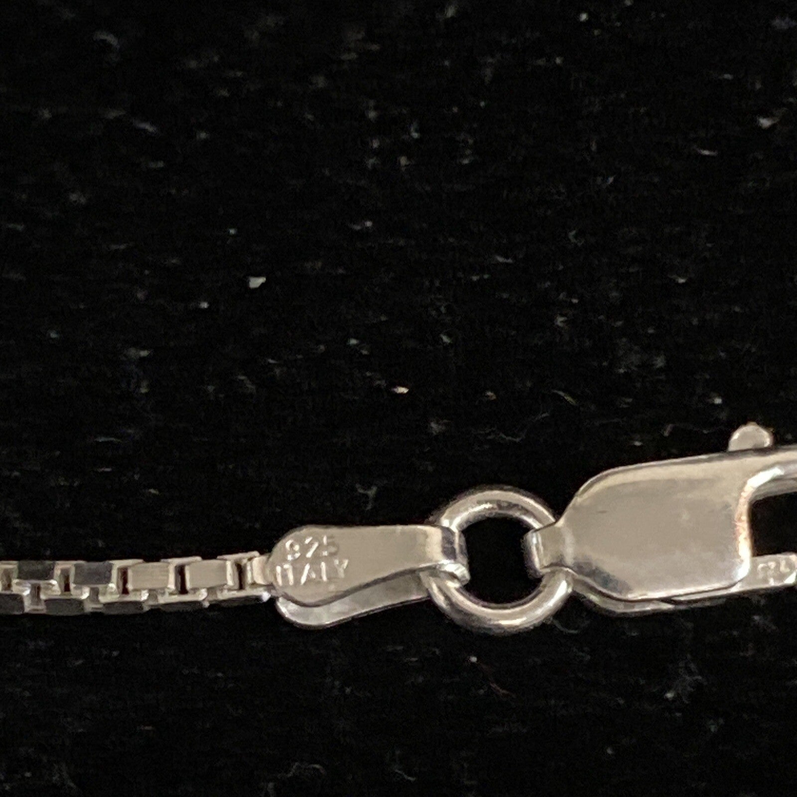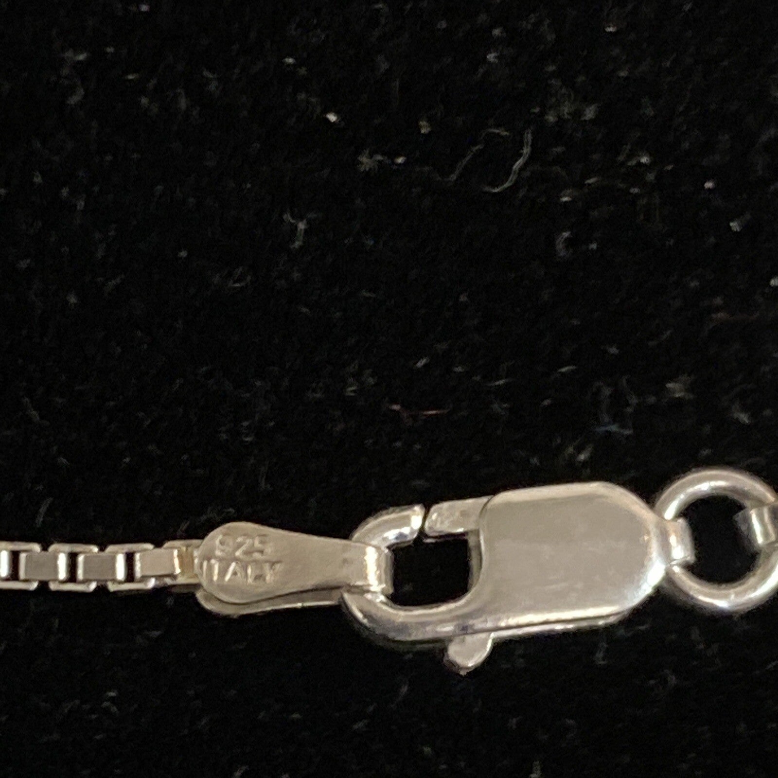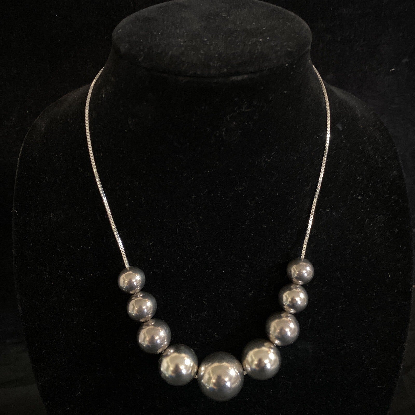 This vintage sterling silver necklace features 9 sliding ball bead design on a 20-inch box chain. The necklace is marked as 925 sterling silver , Italy and features sterling silver beads. Large Center Bead: 21 mm